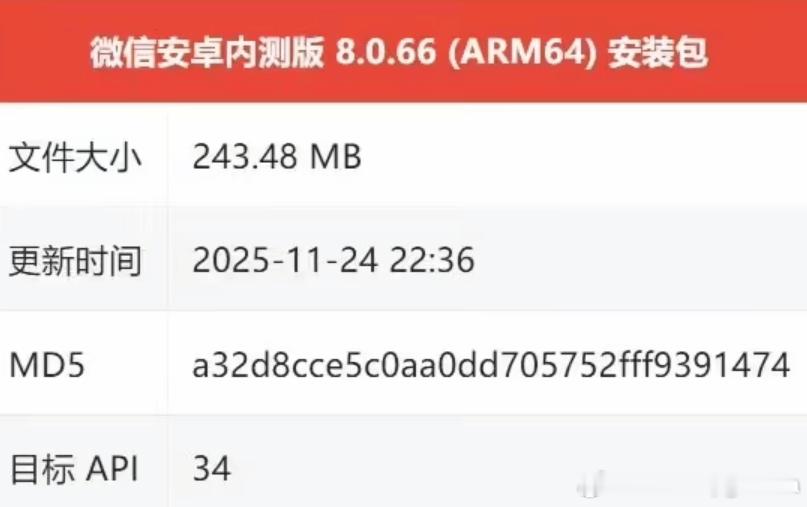 微信又更新微信安卓平台于 11 月 24 日迎来 8.0.66 内测版更新。从安装包信息获悉,本次文件的大小为 243.48MB,目标 API 和最低支持并未调整。经过这两天的深度测试,小编共计挖出了此次最新内测中的八大更新,其中有两个堪称大招级别的灰度测试功能。具体的情况,接下来就逐一向各位说明。一、半屏聊天界面大覆盖在本月初,微信于安卓端开启了“聊天小窗”功能的小范围覆盖,也就是 iOS 用户所熟悉的半屏聊天界面。长期以来,在微信安卓非聊天的界面,比如观看公众号、视频号时,收到好友发来的消息并点击通知横幅,会跳转至与好友的聊天界面。这样消息虽能回复,但会中断看文章和视频,回完消息得重新打开文章和视频,若是聊天窗口能和其他界面共存那就舒服了。而“半屏聊天”的作用正是如此,在微信其他界面点开好友的消息,会从底部弹出半屏的聊天界面,从而直接回好友消息。这个小界面拥有三个选项,左侧为“关闭”,右侧为“标记为未读”和“全屏”,既能做到回复、浏览两不误,也能防止忘记回复。伴随着本次 8.0.66 内测版到来,微信再度扩大了半屏聊天界面的覆盖。二、聊天实况照片大覆盖大家应该都记得在 9 月的更新中,微信曾“反复横跳”,先是给安卓安排了“聊天支持发送实况照片”功能,随后光速撤回。后来在本月初的灰测中,微信又把实况照片带回来了一半,可以在聊天和朋友圈中查看,但是不可发送。不过在此次 8.0.66 内测版中,微信安卓又能重新在聊天中发送实况照片,效果和之前一致:打开单个照片上的实况开关,发送后将包含动态画面和声音;实况开关关闭时,将以静态照片的形式发送。但需要注意的是,该功能当下处于扩大覆盖的阶段,尚未全量上线。三、视频号入口更名在微信安卓 8.0.66 内测版中,视频号的入口更名,和 iOS 对齐颗粒度。“我”界面中的“视频号”变为“视频号和公众号”,图标同步调整为两者的结合体。里面也划分为“我的视频号”和“我的公众号”两个区域,前者能发表视频和发起直播,后者能发图文和写文章。四、语音转文字优化与 iOS 的步调一致,微信同样在安卓 8.0.66 内测版中对“语音转文字”做出优化。首先是图标变常驻,原本只有点击输入框后才会显示其麦克风的图标,现在会一直显示。其次是在首次使用前,图标的左侧新增“轻触说话转文字 → ”提示。最后是初次点击图标后,会出现“说句话,可以转文字...”提示。五、群聊勿扰升级这处功能升级在 iOS 和安卓双端测试有段时间了,并于 8.0.66 内测版中进一步放量。在群聊的聊天信息界面开启消息免打扰,第二个选项由“关注的群成员”变为“以下消息仍通知”。点开后,上方为三个独立开关:4 个关注的群成员,在群内发消息时仍会继续通知。六、朋友圈视频播放器焕新稍微落后于 iOS 的节奏,焕新的微信朋友圈视频播放器亦在安卓上线了。于朋友圈中查看视频,底部进度条更改为播放器的样式,具备半透明的效果。不仅新增“暂停 / 播放”按钮便于操作,还能在看视频时隐藏。七、搜索界面微调在 9 月底的安卓 8.0.64 正式版更新中,有一处调整,那就是搜索界面中“最近在搜”的下方新增一条下划线,与历史搜索内容划分界限。然而在 8.0.66 内测版中,微信又取消了这道横线。八、文件支持预览这处更新,其实有不少网友之前就反馈了。以前在微信中收到文件等消息,点开后只有“下载”一个选项。前段时间,微信又加入了“预览”的能力,允许在不下载的情况下查看,并且下方提示亦调整为“14 天内可以预览和下载”。九、总结关于微信安卓 8.0.66 内测版的更新情况,目前能挖到的就是这些了。整体看下来,“半屏聊天”和“聊天发送实况照片”很带劲,一个是界面变便捷、另一个是聊天变生动,希望能尽快全覆盖。从时间线来推算,双端的 8.0.66 正式版预计会在 12 月上旬推送,那就意味着 8.0.67 内测版有概率在年内启动测试。2025 年的最后一次更新,究竟是属于 8.0.66 正式版还是 8.0.67 内测版,让人期待。