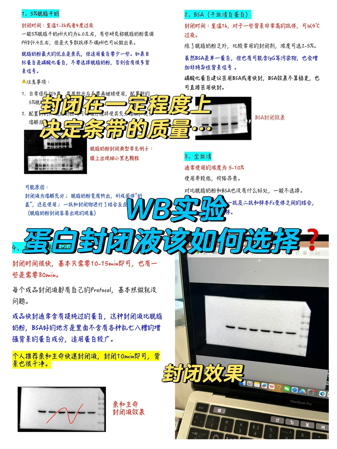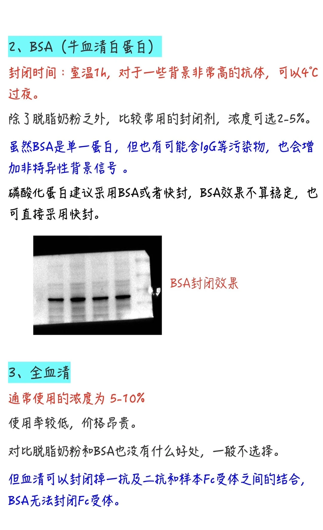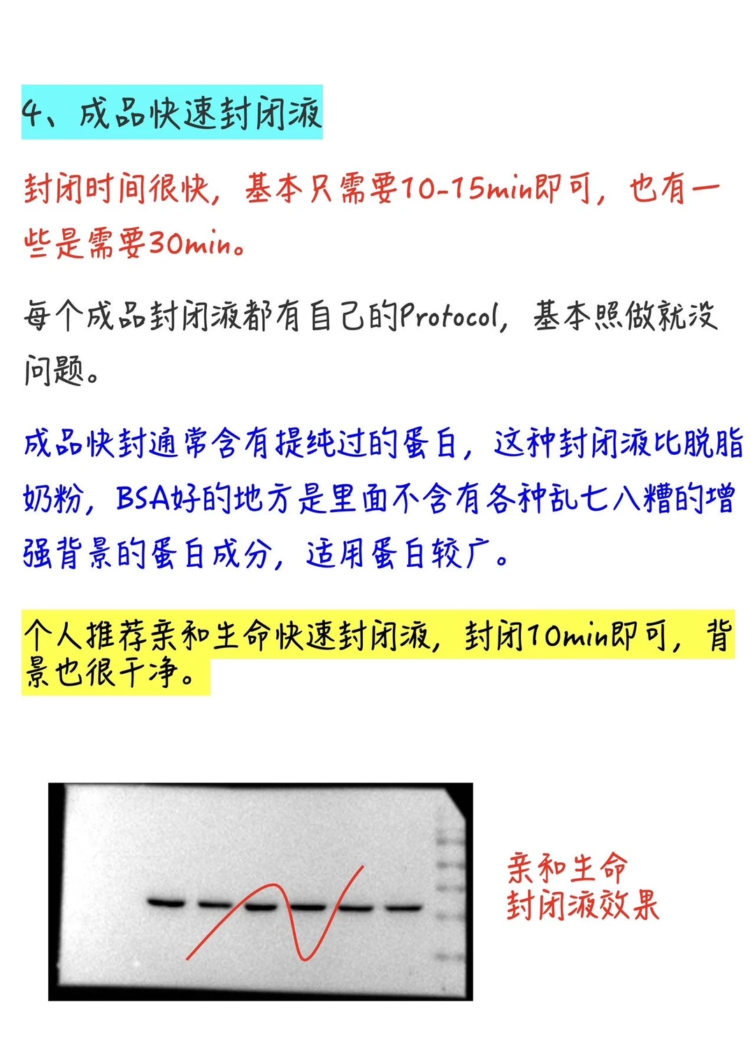 [向右R]封闭液的选择主要基于抗体和目标蛋白,日常内参,一些本底较高的蛋白用脱脂牛奶封闭没问题;磷酸化蛋白可采用BSA和快封,如若丰度低或测分泌蛋白个人比较推荐使用成品快封,脱脂牛奶和BSA效果其实都不太稳定。