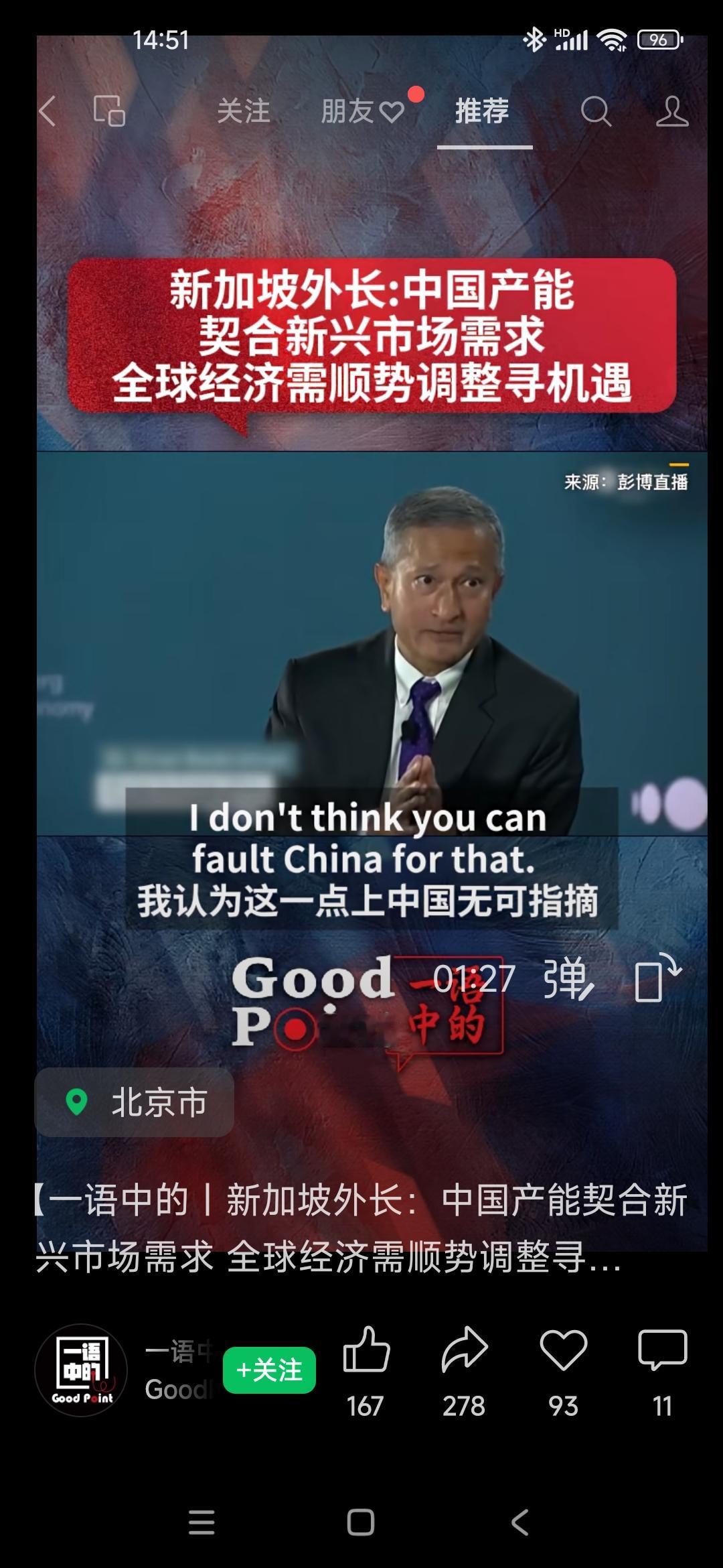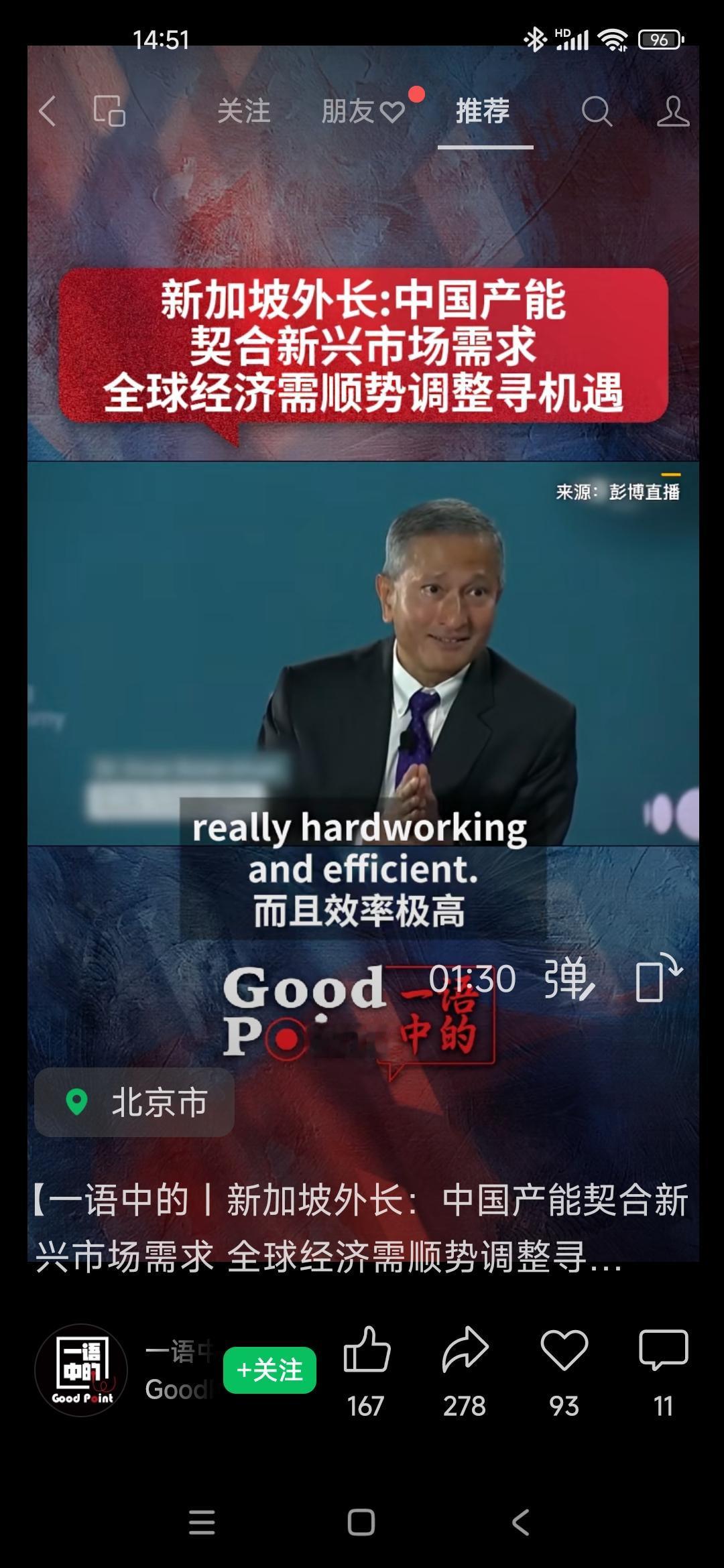 新加坡外长谈:中国产能契合新兴市场需求,全球经济应该顺势调整,寻求机遇。 第一 中国劳动者真的是非常勤奋,而且效率极高,这一点毋容置疑! 第二 我们不带偏见,也不做价值判断,我们问自己,中国国内经济结构是否需要调整的?答案是的 第三,东南亚,非洲,南美洲需要做什么? 第四,中国在基础建设、绿色能源人工智能、AI及生物科技都取得了瞩目的成绩。 第五,让我们拭目以待,在国内层面或者是跨境跨区域层面,调整都会发生,我们需要做的是顺势而为。