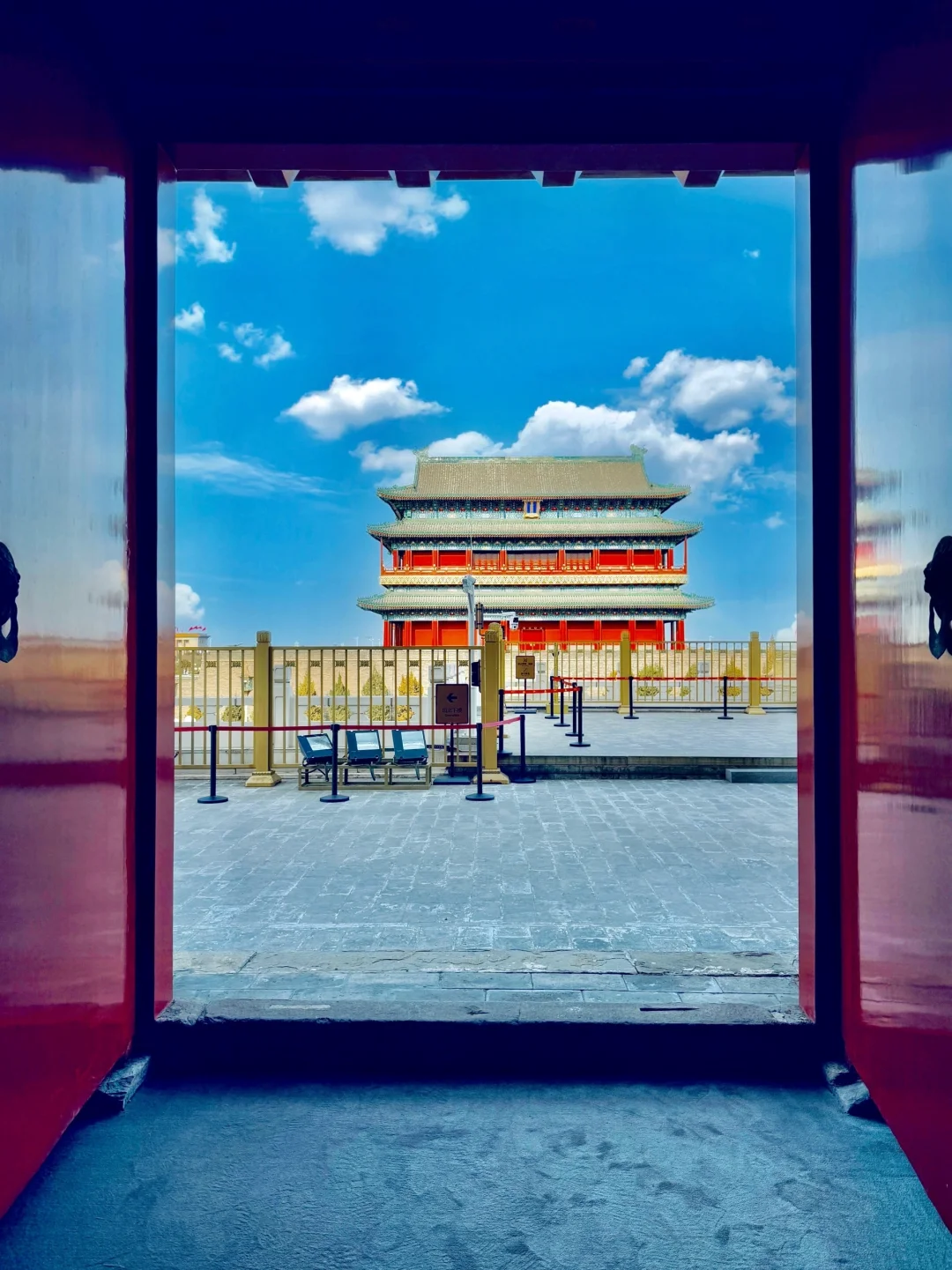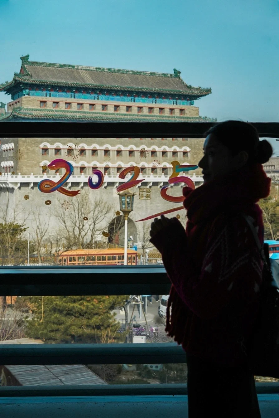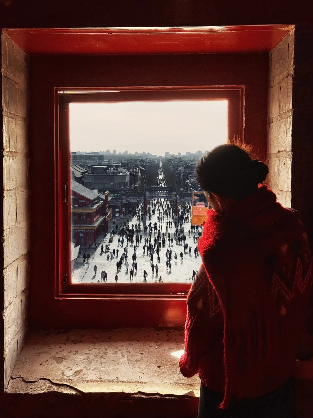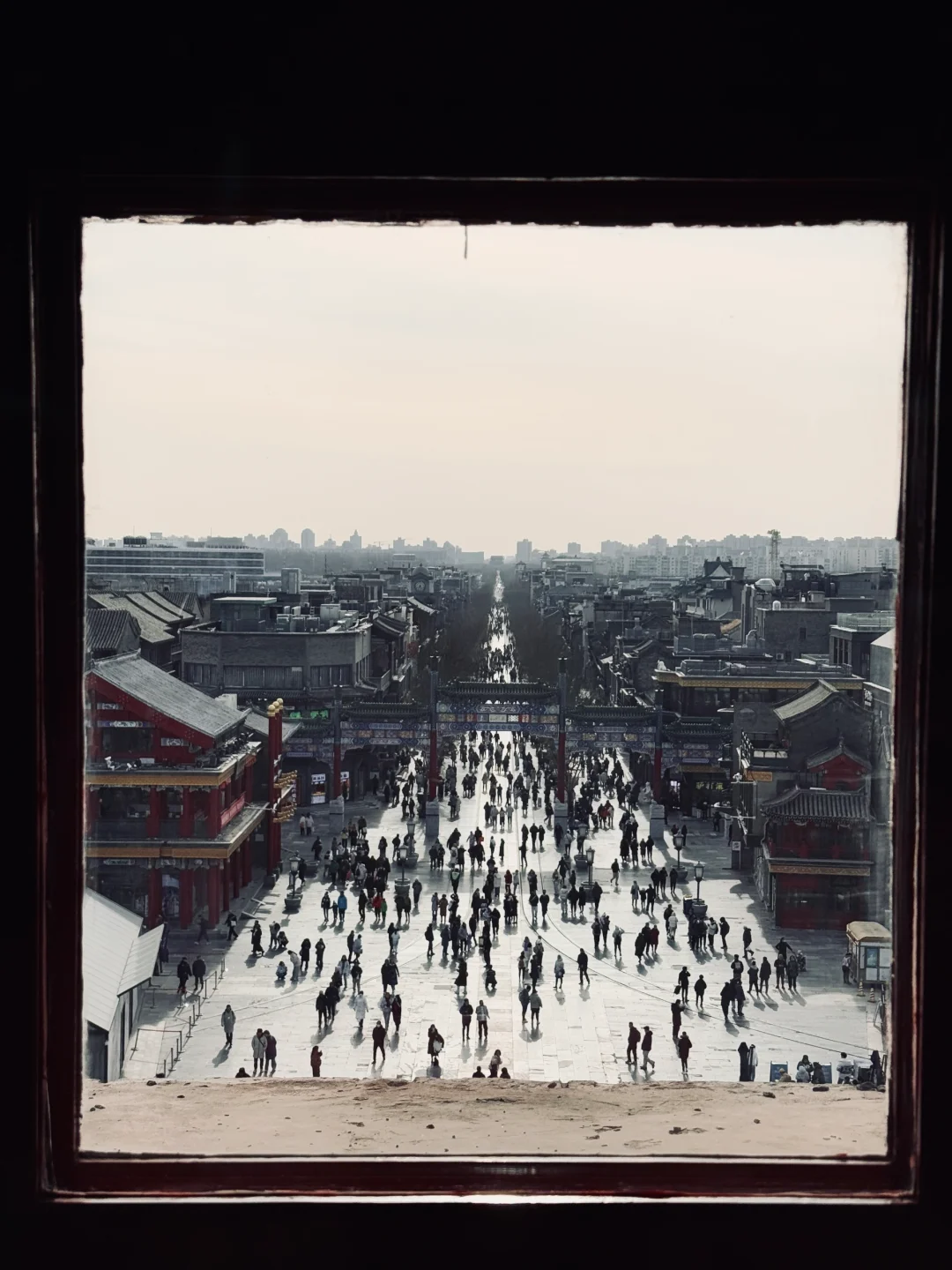 ▪️二层入口大门,以门为边框,可以拍到正阳门城楼▪️四层找到正中位置,人物剪影位于右下四格,焦点落在窗户外的前门大街中轴线