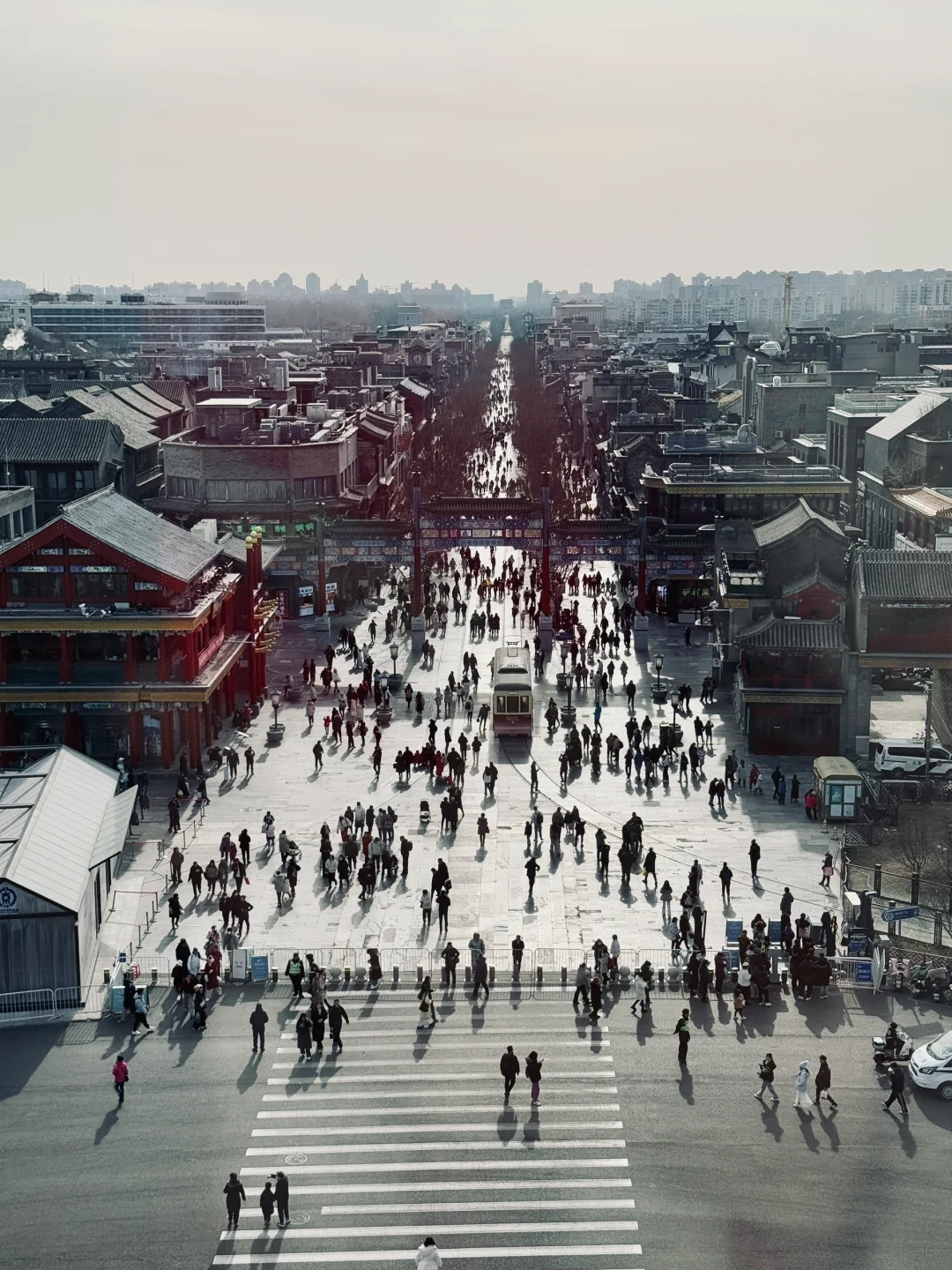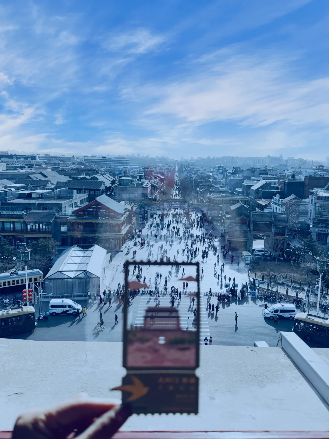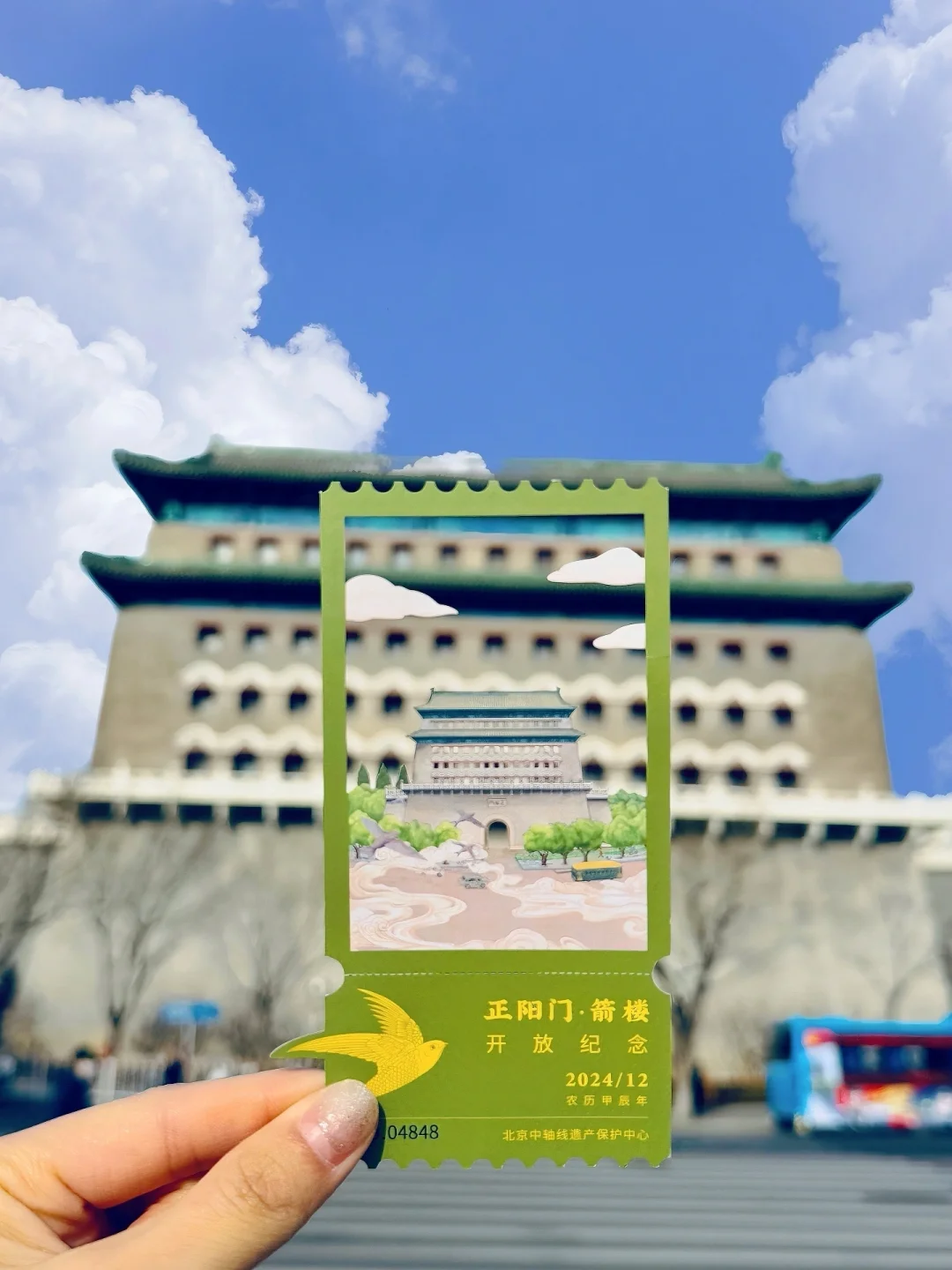 ▪️站在前门大街马路边,拿纪念门票和箭楼合影