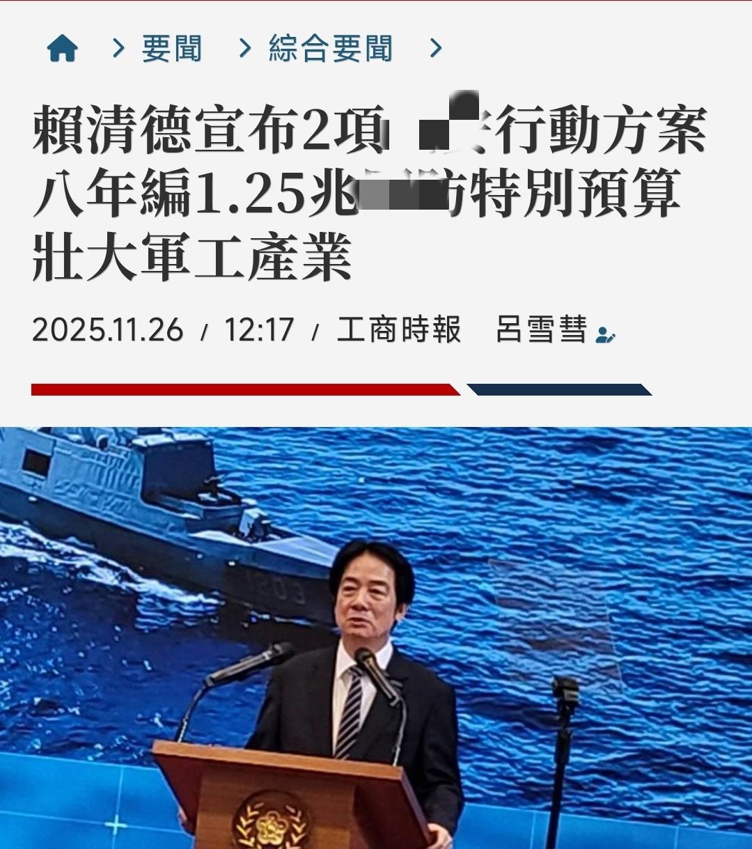 突发新闻,赖清德11月26日上午召开安全高层会议,就当前安全情势,听取团队简报,并于会后召开记者会。 就在这场会议的前一天,11月25日,他已通过《华盛顿邮报》提前释放信号——宣称台湾将推出400亿美元防务特别预算,字里行间满是对美方的感谢与依赖,甚至将大陆直接称为“境外敌对势力”,抛出17项所谓“因应措施”。 26日的记者会上,这份防务计划的核心数字终于揭晓:未来八年投入1.25兆新台币(约2825亿人民币),从2026年到2033年,这是台湾历史上规模最大的防务特别预算。 他将其包装为“台盾”(T-Dome)防空系统,声称要防护飞弹、火箭、无人机及战机攻击,企图在军事技术层面构建所谓“防御屏障”,为自己的政治路线增加筹码。 拆解预算明细,2026年度即达9495亿元新台币,同比增幅超过22%;其中“军事投资”1616亿元,特别预算1868亿元,新式战机采购399亿元,海空战力提升计划293亿元——每一个数字背后,都是对军备扩张的直白注解。 但台湾的财政账本上,另一组数字正在悄然变化:今年经济发展支出占比已从14.3%下滑到14.1%,防务支出却逆势上扬。当传统产业还在承受美高关税冲击时,这样的预算结构,正让经济失衡的裂痕越扩越大。 对此,大陆方面的态度清晰而坚定。国台办第一时间批评民进党当局“不自量力”,直指“以武谋独”只会加速自取灭亡,强调台湾与大陆同属一个中国,这是不容置疑的事实。 赖清德似乎并不在意这些。从《华盛顿邮报》文章中对美国的多次感谢,到记者会上对“外部支持”的刻意强调,他的防务路线正清晰地指向“倚美自重”——这种将台湾安全绑在外部势力战车上的做法,让台海局势的复杂性与危险性陡增。 岛内社会并非没有清醒者。有民众担心经济被军费拖累,有分析指出盲目扩充军备只会加剧两岸紧张,而经济民生却成了最大牺牲品。数据不会说谎:当防务预算“一枝独秀”,经济发展项目占比持续下滑,这样的结构长期下去,无异于饮鸩止渴。 更值得警惕的是“安全行动方案”中的管控条款——赖清德提出要严格限制岛内外团体与大陆的交流,企图用行政手段阻断两岸正常沟通。这样的举措,只会加剧岛内分裂氛围,动摇社会稳定根基。 大陆方面一再强调,台湾问题是中国的核心利益,统一是必然趋势。民进党当局一味加码军事对抗、强化“台独”色彩,既违背历史潮流,也不符合台湾民众根本利益。 专家分析,这份八年期防务计划无论从规模、跨度还是采购清单看,都是前所未有的。1.25兆新台币分批投入的背后,既有美方的推动,也有“以武拒统”的政治算计,但社会福利、经济发展等领域的资源被挤压,已是不争的事实。 赖清德试图用“台盾”工程和“防务自主”打造技术壁垒与心理防线,却刻意忽略了两岸和平对话的核心价值。1.25兆新台币或许能买到一时的政治筹码,但买不来台海的真正安全——祖国统一的历史大势,不会因任何形式的军事对抗而逆转,“台独”分裂行径,注定只会走向失败。