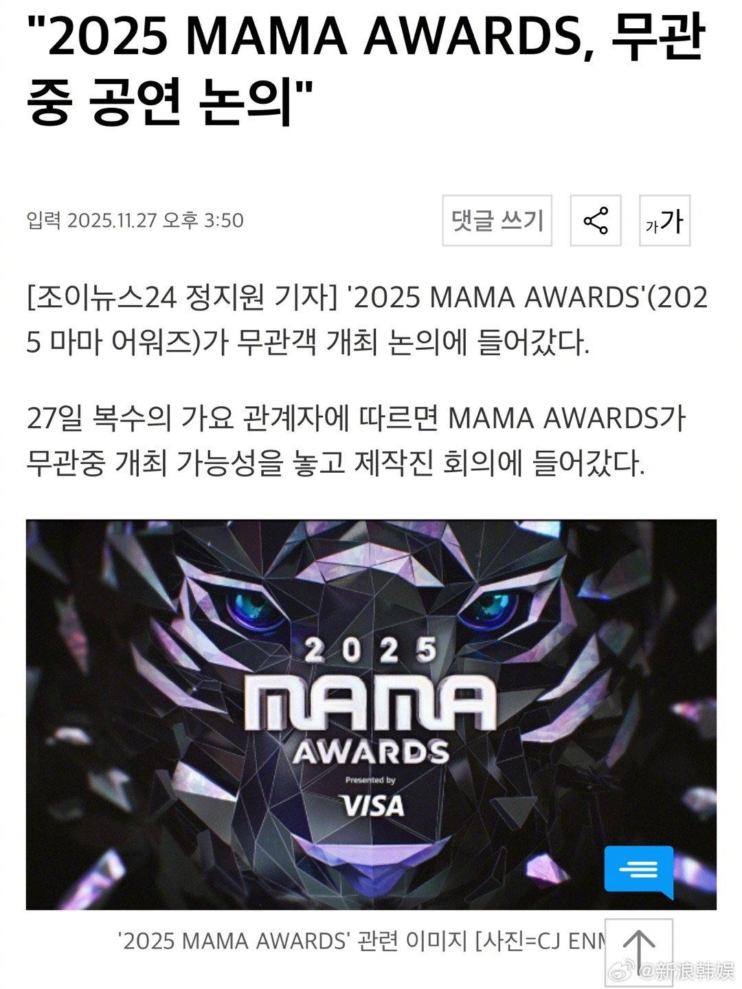 MAMA取消红毯 据韩媒,《2025 MAMA AWARDS》红毯取消。