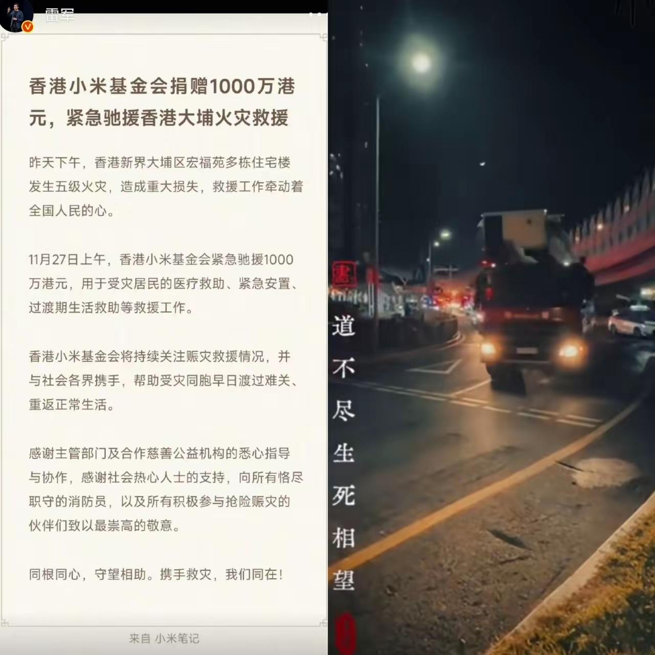 这个世界上我最佩服的人就是雷军了, 11月26日香港大埔宏福苑突发大火, 雷军于11月27号一早便宣布,香港小米基金会捐1000万港元,专门帮受灾居民治病、找临时住处、解决生活急需问题。这份果断真的太圈粉! 紧接着,腾讯、阿里、字节跳动这些企业纷纷跟上,每家都是千万级捐款,阿里更是直接调运食物、被褥送到灾区;周大福、安踏等香港本地企业也没闲着,捐钱捐物毫不含糊,短短一天就凑了超2亿港元。更让人感动的是深圳市民,连夜打包御寒物资支援香港,这份跨越深圳河的温暖,太戳心了! 曾经内地有难,香港同胞伸手相助;如今香港受灾,我们自然全力以赴。这不是简单的"回报",而是中华儿女刻在骨子里的"一家人"观念——不管是内地企业还是香港企业,不管是深圳市民还是香港同胞,只要心往一处想、劲往一处使,再大的困难也能扛过去!你被这份跨越地域的温暖打动了吗?评论区聊聊!香港夺命大火 雷军