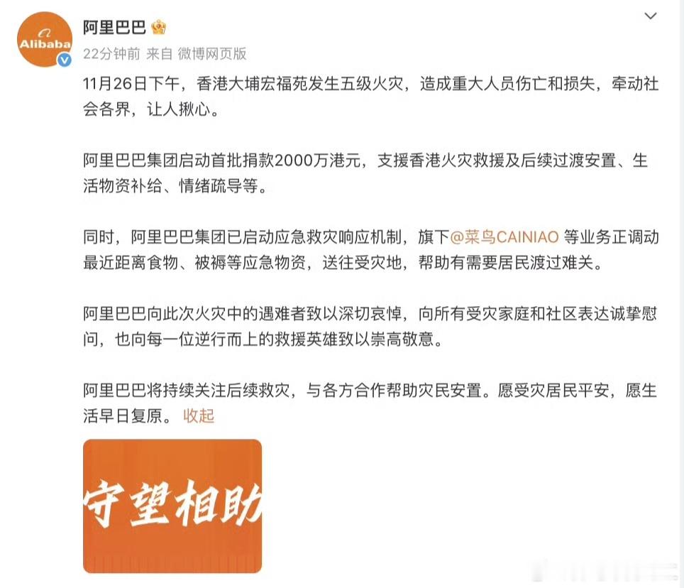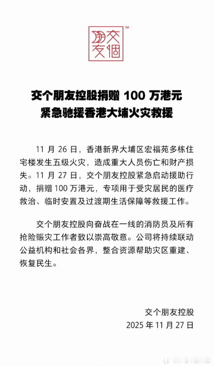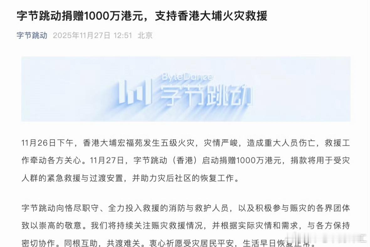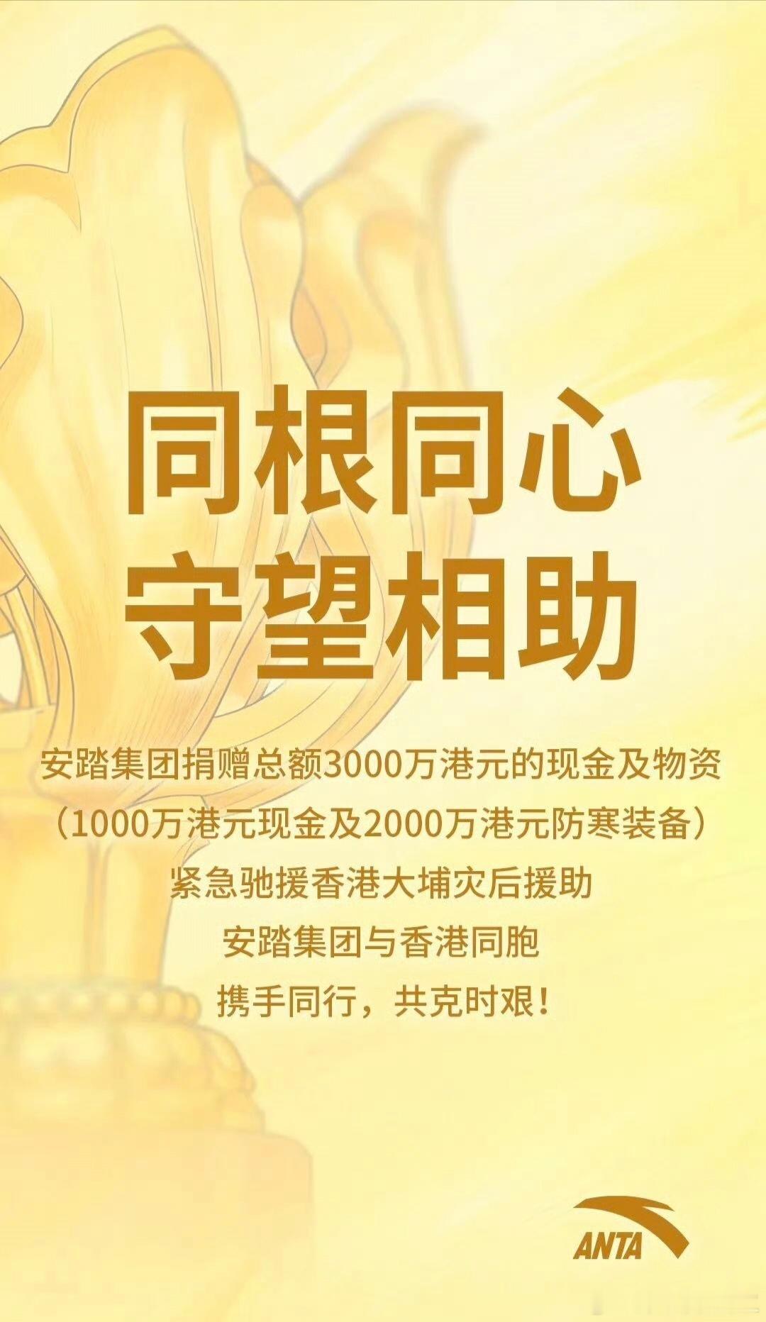 一方有难,八方支援。大陆多家企业捐款驰援香港大埔火灾救援小鹏汽车:捐赠500万港元香港小米基金会:捐赠1000万港元比亚迪:捐赠1000万港元腾讯基金会:捐赠1000万港元马云公益基金会:捐赠3000万港元安踏:捐赠总额2000万港元现金及1000万港元防寒装备阿里巴巴:捐赠2000万港元字节跳动:捐赠1000万港元交个朋友控股:捐赠100万港元多家企业捐款驰援香港小鹏汽车捐赠500万港元驰援香港腾讯捐赠1000万港元驰援香港