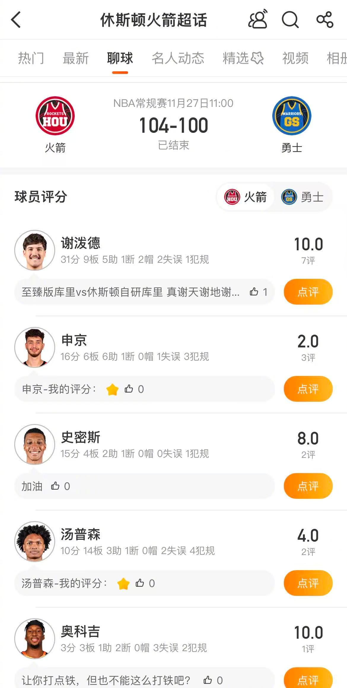 勇士不敌残阵火箭火箭战胜勇士 火箭104-100战胜勇士。杜兰特缺阵,谢泼德得分新高31分,申京16分。勇士方面,库里14分,最后一节还有35秒时退场。巴特勒21分5篮板5助攻,理查德18分。谢泼德31分库里状态进入球队超话休斯顿火箭 和金州勇士 为球员今天的表现评分吧! 火箭vs勇士