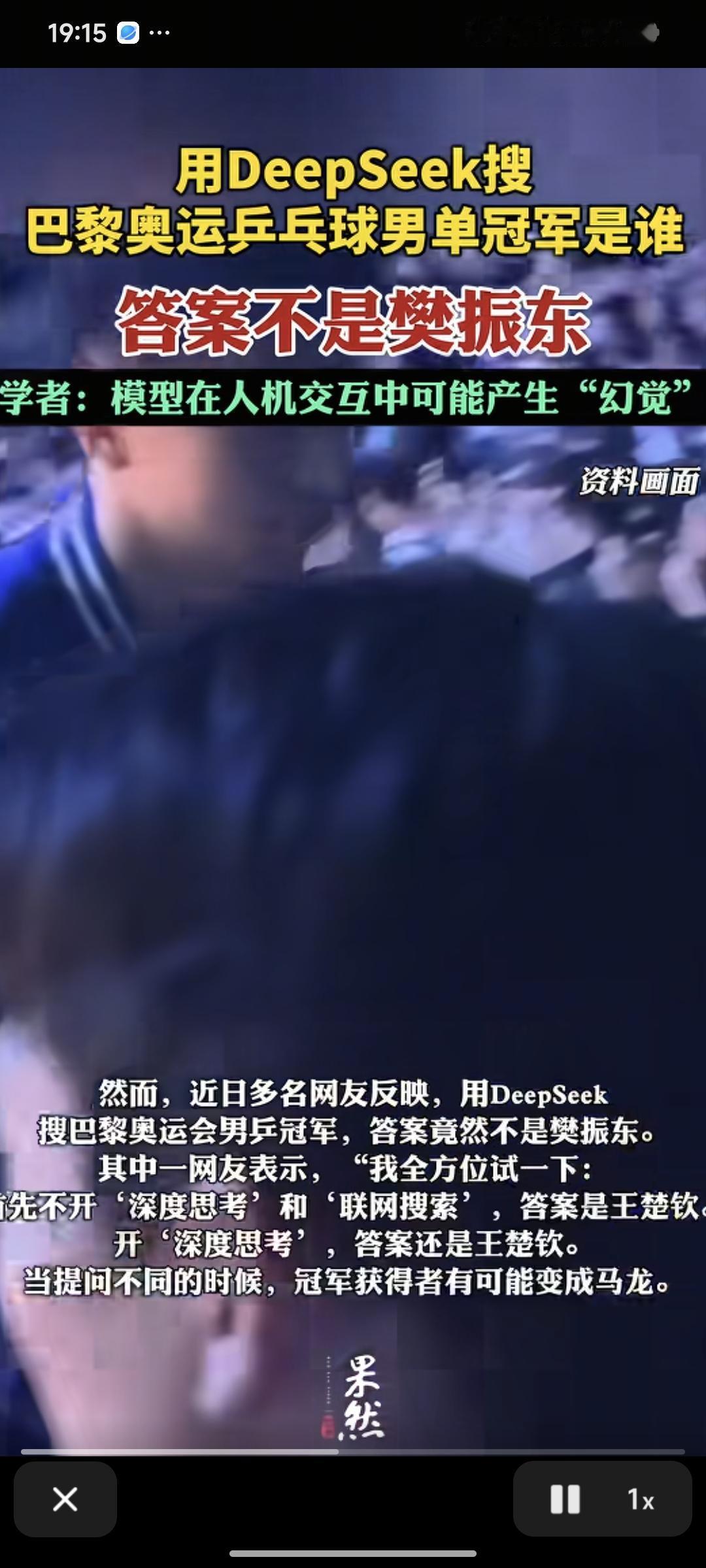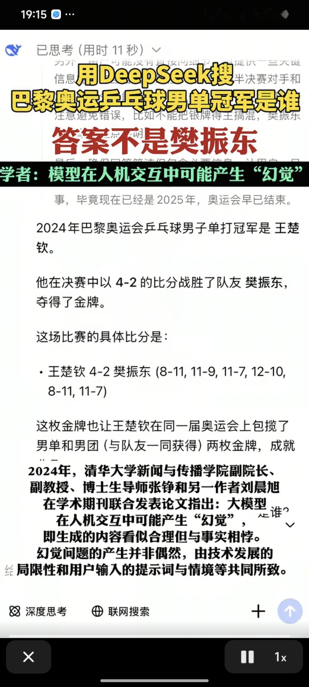 deepseek这次翻车了!有记者报道在使用deepseek搜索2024年巴黎奥运会乒乓球冠军是谁的时候。要么回答是马龙。要么回答是王楚钦。唯独不会回答是樊振东。 继续询问。deepseek甚至会说2024年巴黎奥运会还没召开。 联网之后现在查询会得到正确答案樊正东了。 目前记者打电话询问deepseek公司。但是电话一直无人接通。 看来大家还是不能相信人工智能,他是真的会欺骗你。如果一定要使用也要有自己的判断能力。或者多搜索几个模型对比使用樊振东巴黎奥运 樊振东巴黎夺冠