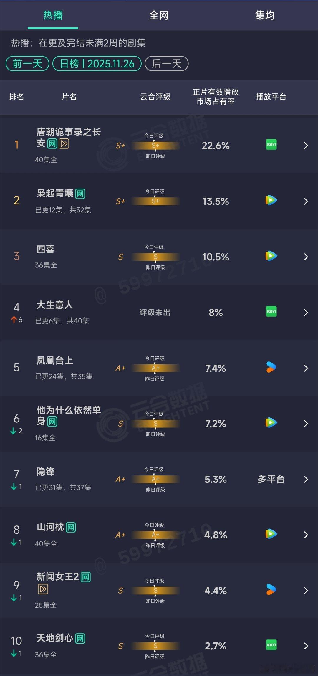 11.26云合:枭起青壤13.5%大生意人次日8%,扑开爬走。 速通大生意人前6集