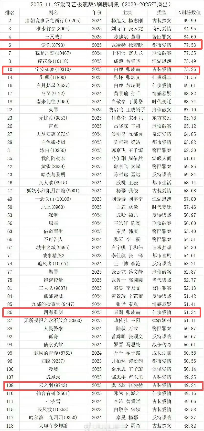 2023-2025爱奇艺极速版n刷榜剧集,张凌赫主演的四部剧全部登榜,两部进入前十,名副其实的长尾之神!