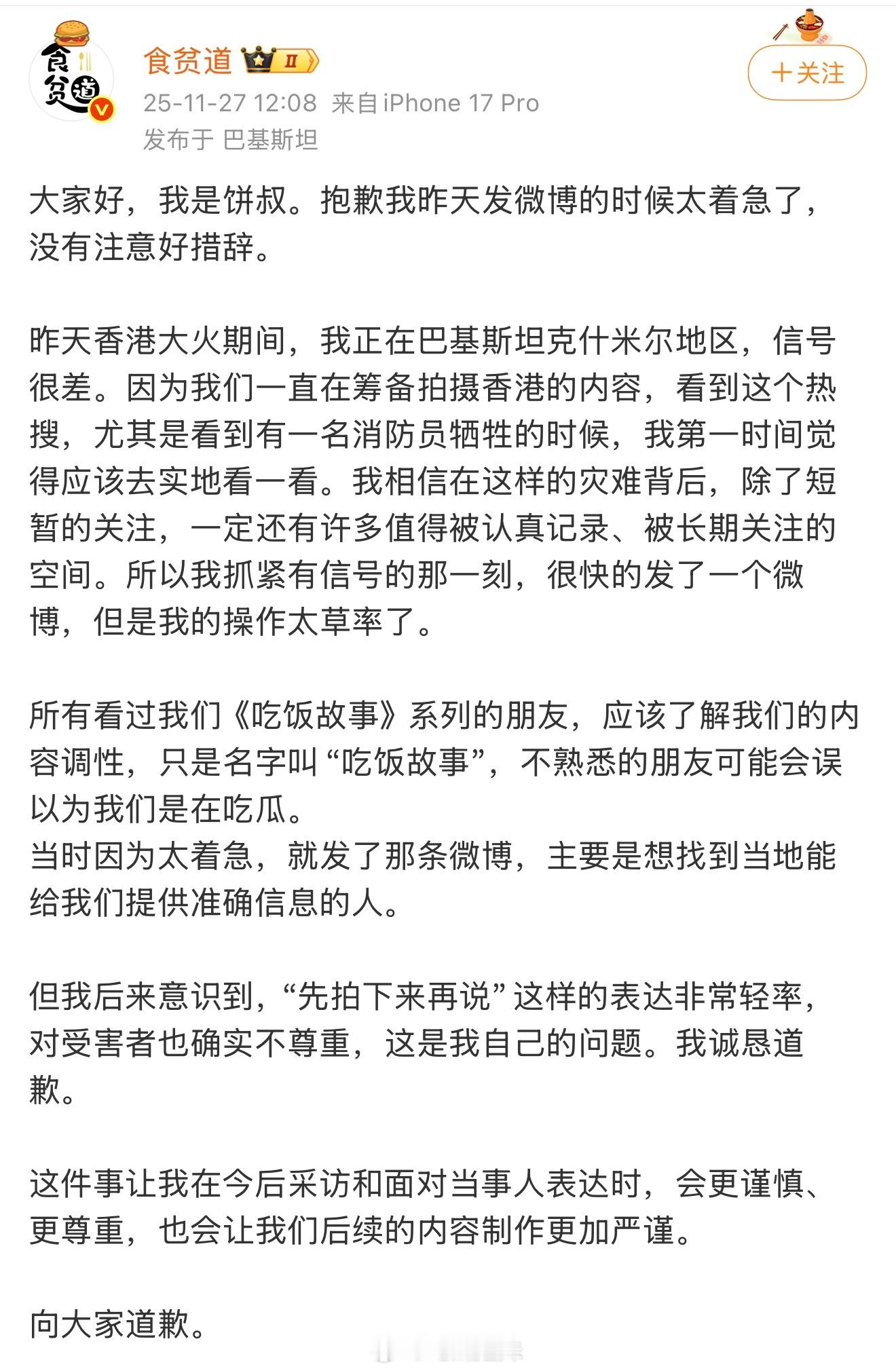 食贫道道歉博主食贫道为昨天微博里香港火灾表述不当道歉了