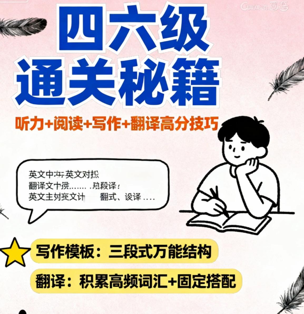 四六级最后冲刺通关秘籍🔥 看完直接提分!距离四六级考试只剩最后几天!别慌!这份干货秘籍帮你高效突击,闭眼冲425+💥✅ 写作高分技巧:3段式模板直接套!开头用「Nowadays/As we all know」引题,中间分2-3点用「First of all/Besides/What’s more」衔接,结尾用「In conclusion/From my perspective」总结,替换「very good」为「excellent/outstanding」,高级感拉满!✅ 听力提分关键:提前圈题干关键词!听到「but/however/so」等转折词立刻警觉,答案大概率在后面;短对话抓「时间/地点/数字」,长对话重点记「观点/建议」,没听清别纠结,赶紧看下一题!✅ 阅读快速秒杀:先题后文!仔细阅读定位题干关键词,同义替换就是答案;匹配题先划选项核心词,再回原文找对应段落,不用逐字读;选词填空先判断词性,再结合语境排除,优先填动词和名词!✅ 翻译避坑指南:遇到不会的词换简单表达!比如「传统文化」直接说「traditional culture」,不用硬凑复杂词汇;注意时态和单复数,句子别太长,多用简单句和从句,避免语法错误!最后提醒:准考证提前打印!带好耳机、2B铅笔和身份证,考试时合理分配时间,不会的题先标记,别空着!转发给正在备考的同学,一起过过过!🎊 祝大家都能高分通关,顺利拿证!决战四六级
