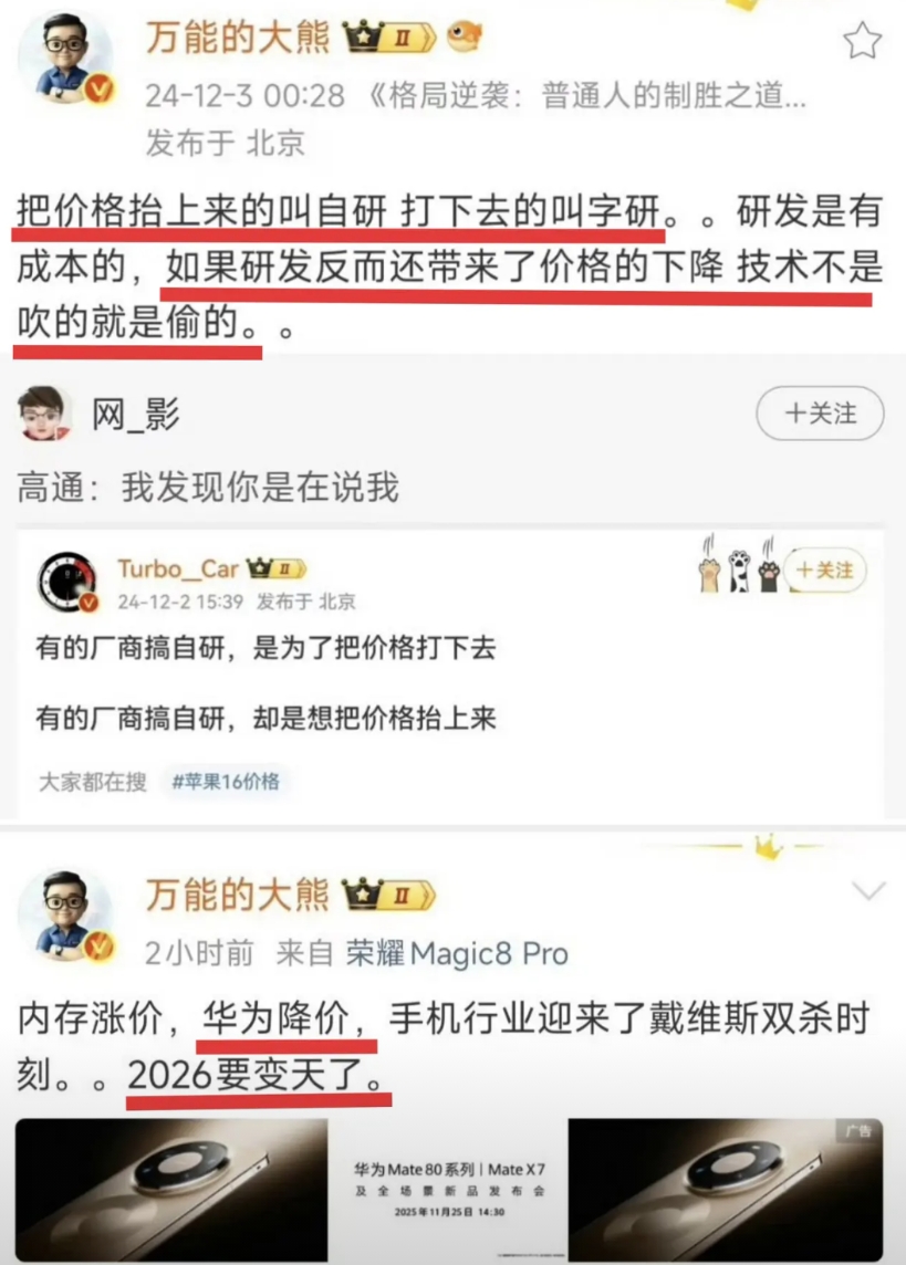 一年前的熊老师 把价格抬上来的叫自研,打下去的叫字研。 如果研发反而还带来了价格的下降,技术不是吹的就是偷的。 一年后的熊老师 华为降价,2026要变天了!