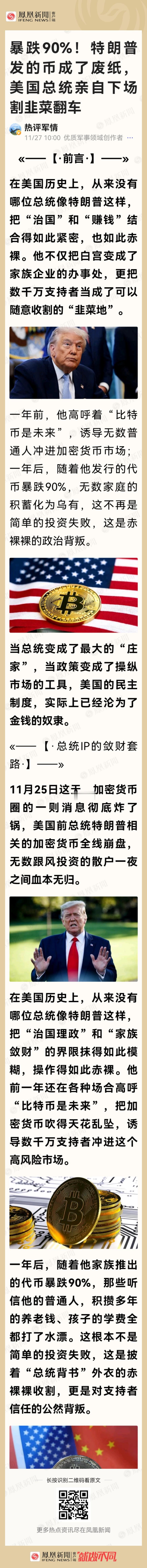 特朗普家族把庞氏骗局推向了新的高度——特朗普数字加密货币疯狂收割美国乃至全球的信徒。在所谓自由民主的表象之下,制度性腐败达到了登峰造极、无可比拟的程度! 将总统职位当作明目张胆的金钱交易筹码,借关税战掠夺全球财富以充实美国腰包,在和平与战争之间随意操控以中饱私囊——无论是股市操作,还是加沙房地产开发、亚美尼亚特朗普走廊开发,再到利用特朗普数字货币收割信众,放眼世界,有谁能比特朗普总统更善于利用职权敛财呢?