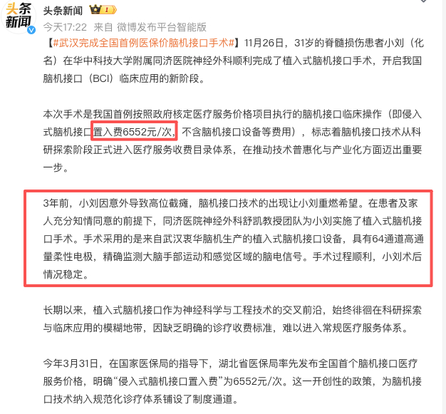 武汉完成全国首例医保价脑机接口手术 技术造福人类,这样的技术很强大,也很有用,之前一直听到的马斯克的那个脑机接口技术,国内也早就这方面的技术,并且现在也有案例的了,而且还可以走医保,强!看这个的置入费6000多,也不是想像的天价,技术平权,技术平价,才是最重要,也是有实用性。