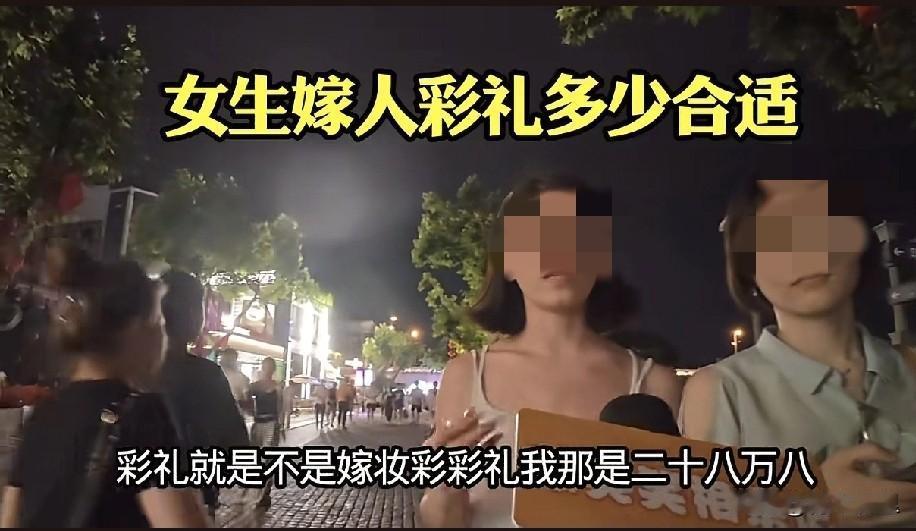 不知这是不是剧本,每次看到这样的视频,总让人想说点什么。 一位博主随机采访路过的女生,只问了一个问题:要是嫁人,要多少彩礼才合适?有的女生说要18.8万,有的要28.8万,还有的要三四十万。当博主问为什么?女生的理由很统一,我们那边的习俗基本上就是这么多。 现在的结婚率低是有原因的。现在的男生结婚不靠父母的话基本上要工作个两三年才能凑够彩礼。如果女方要车要房,基本上要把男方家底掏空,还不一定够[泪奔]。看到这样的结果,很怀疑现在的00后男生还会想结婚。