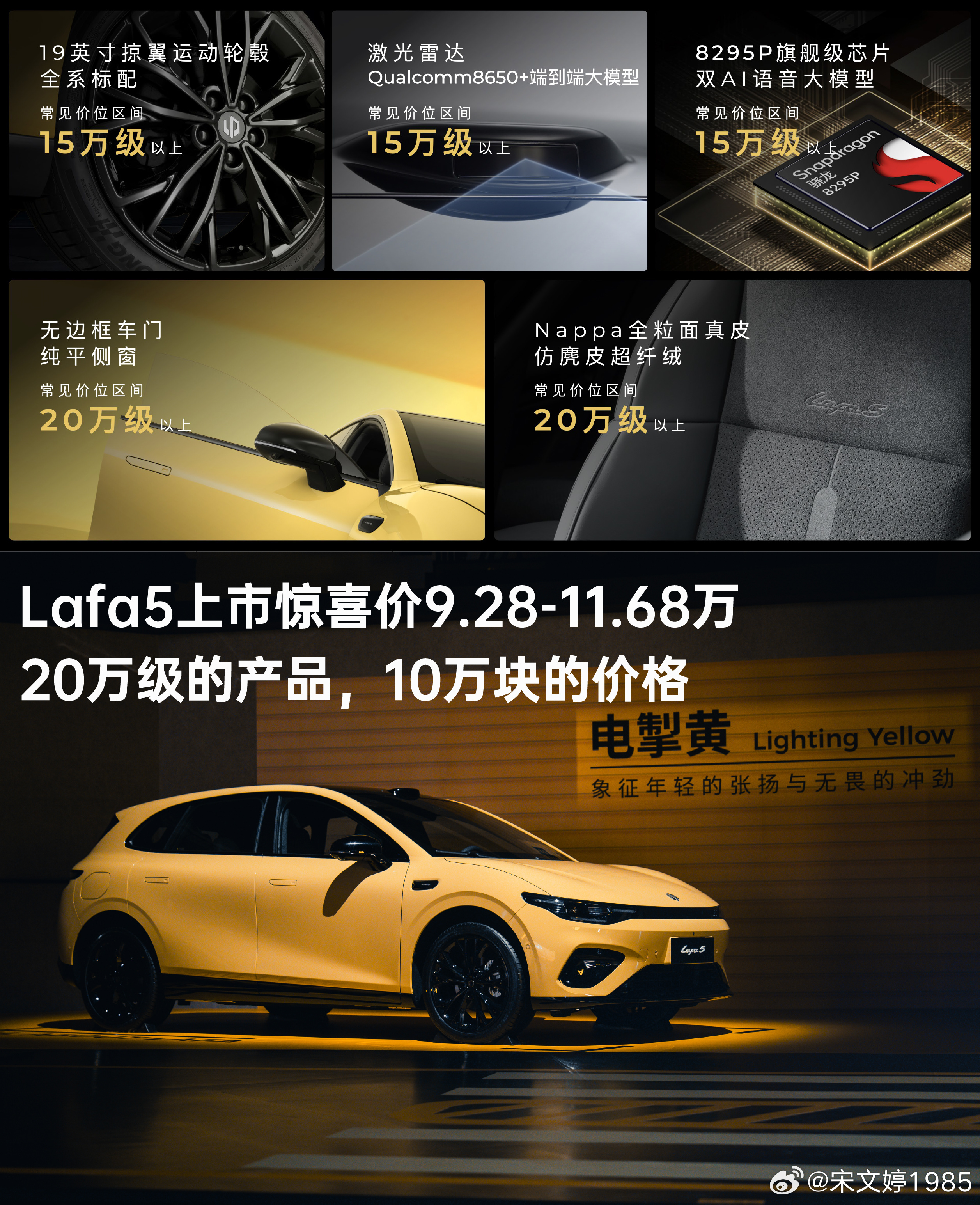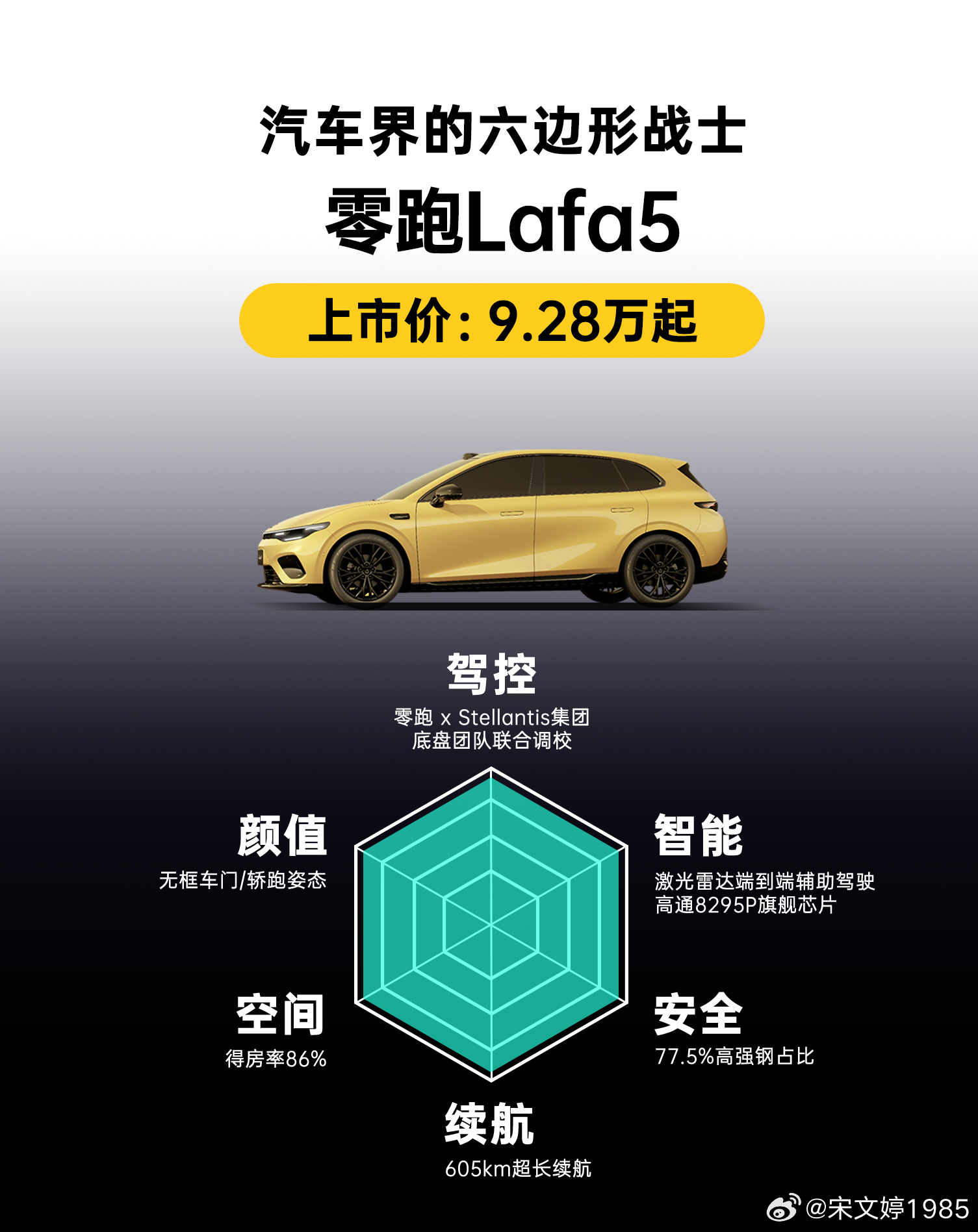 Lafa5,零跑挺“型”啊 让年轻人都开得起“拉法”了哈哈哈(限时惊喜价9.28万起!我开得起很像钢炮还叫拉法的车的快乐,懂?)我一直崇尚车辆操控的,虽然Lafa5个头比同类型的汽油车高一点,这是因为纯电车电池天然自带的高度无法避开,但在10万级车里从设计实用还是乐趣已经平衡得很可以了。605km续航无框车门19寸轮毂智能座舱电动遮阳帘50W快充8295+8650芯片端到端辅助驾驶……我没开过Lafa5,但基于对零跑其他车型的认识,Stellantis出手调校的底盘会有欧系运动车的风味的。最后想问大家:你觉得这台车会是谁最大的竞争对手呢?零跑Lafa5开启轿跑10万级时代年轻人首选Lafa5限时9.28万起