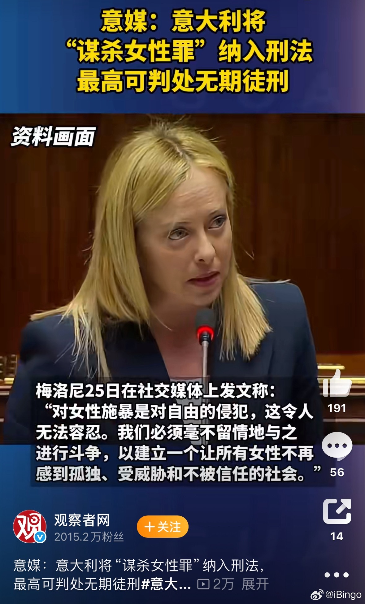 意大利将谋杀女性罪纳入刑法啊?谋杀女性和谋杀他人有啥区别啊?