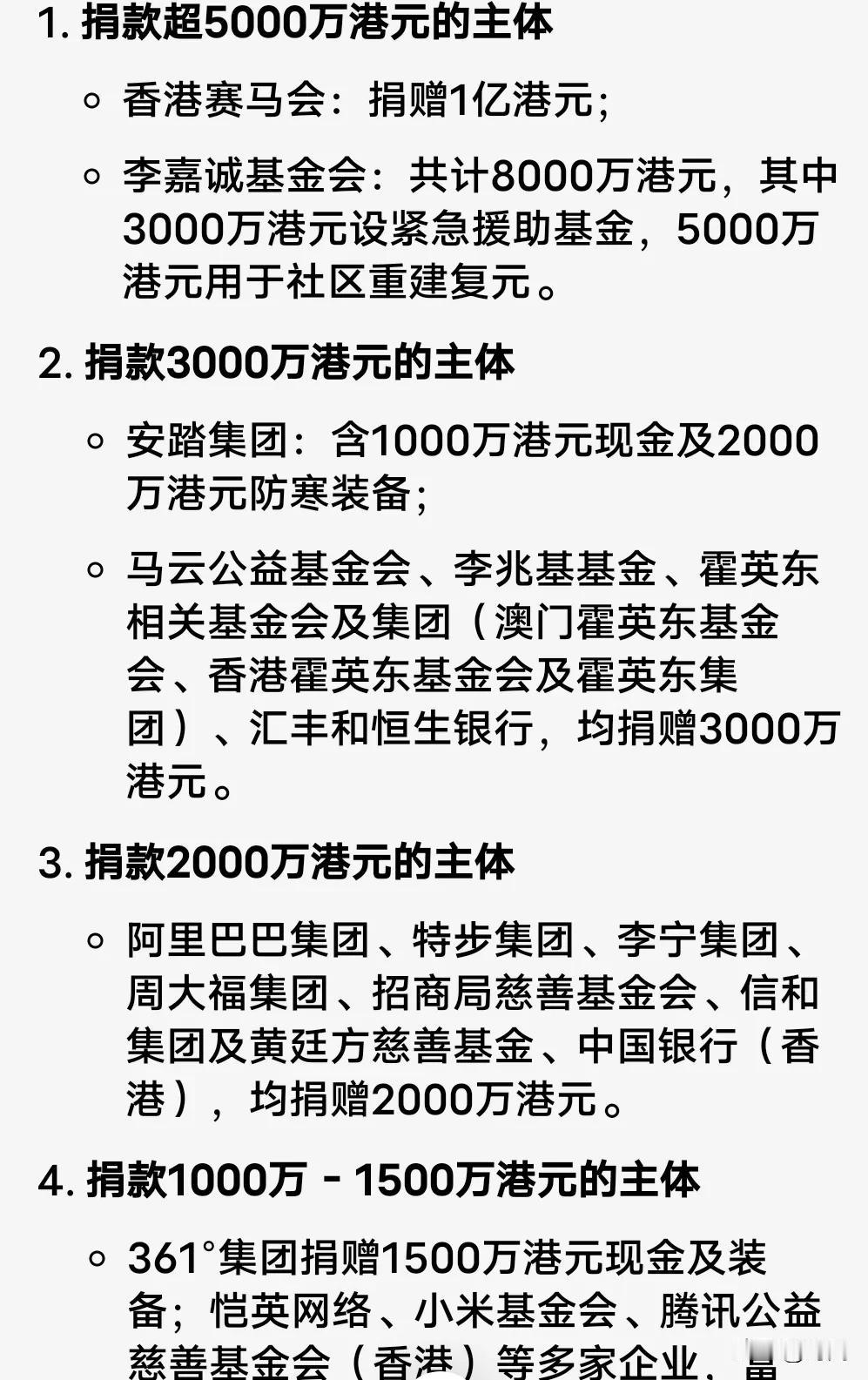 香港大楼火灾已致超过60多人遇难,传小区有20亿保险,各地企业开始捐款竞赛。事发11月27日,据确认起火的小区宏福苑曾向保险公司投保,中国太平保险(香港)有限公司表示,公司已派员介入处置,将按合同约定进行处理。 与此同时,国内多家企业开始为香港募集资金用于安置无家可归的家庭和遇难者,以及后期重建的资金。目前所有公司单位个人的捐款已经超过3亿元左右,其中小米汽车捐款1000万,华为鸿蒙捐款500万,李嘉诚基金捐款8000万,马云等基金会均捐款3000万。 各大企业个人基金会向香港捐款 香港起火小区投保太平洋保险保额20亿