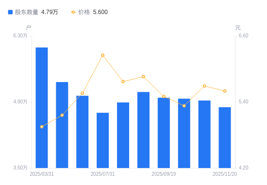 日期A股户数(户)流通A股户均持股数(股)户均持股市值(万元)2025-11-204790029422.0516.482025-11-104930028586.5316.272025-09-304969628358.7415.122025-09-194990028242.8115.532025-08-205110027579.5716.162025-08-084890028820.3716.632025-07-314670030178.0718.862025-07-185030028018.2115.582025-06-305322426478.9613.662025-03-316055923225.9511.50