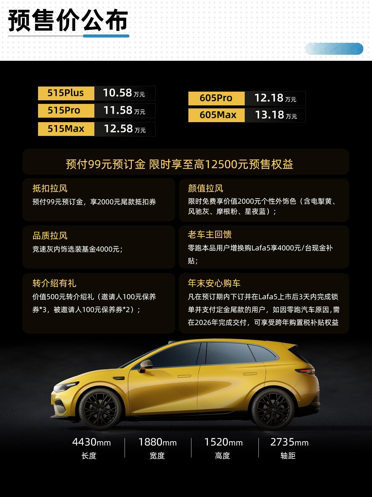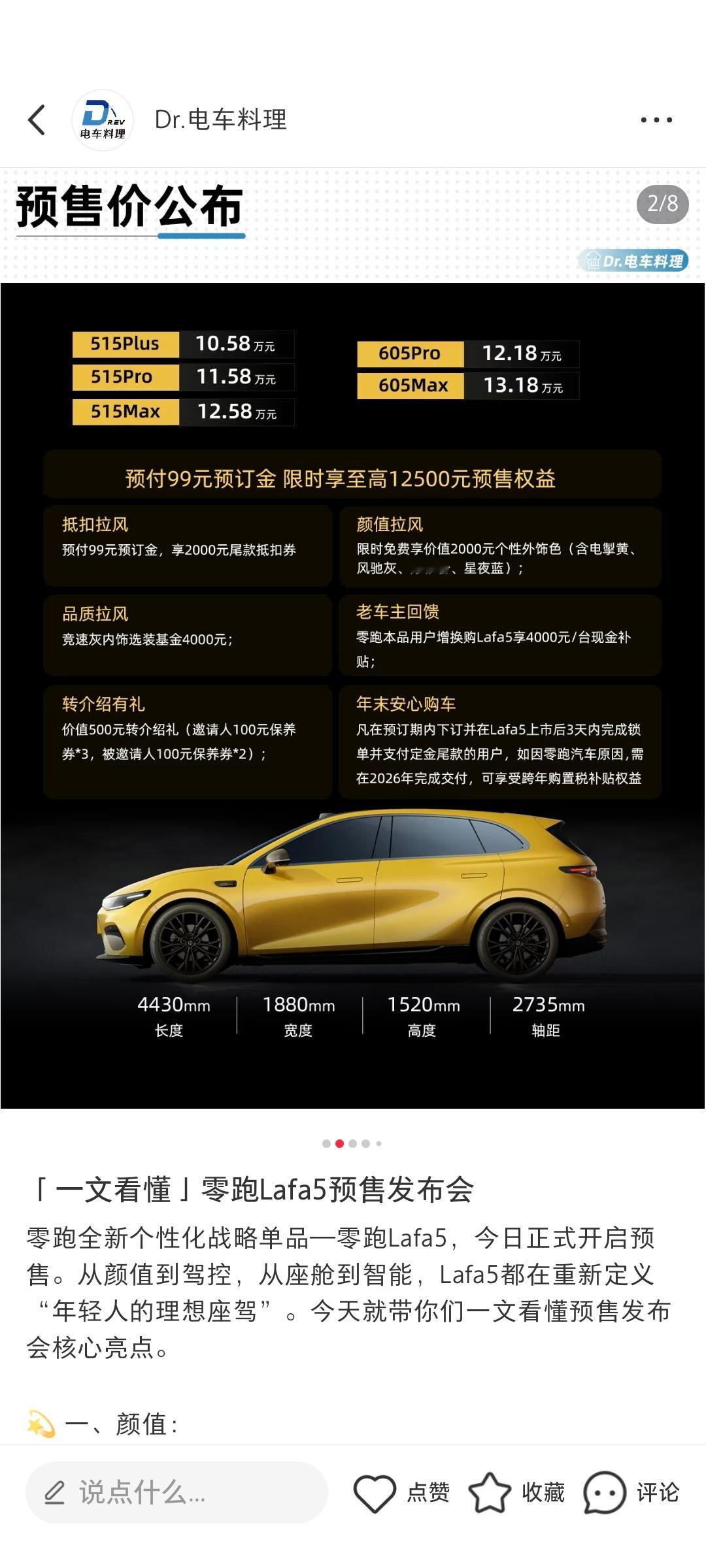 零跑Lafa5开启轿跑10万级时代年轻人首选Lafa5限时9.28万起这不就是年轻人的MINI cooper吗?零跑 Lafa5 今天正式上市啦!两种续航、五款车型,限时价从 9.28 万起。对95后来说,车早就不是“代步工具”,而是自己的个性标签。以前10万级很难买到真正好看、好开、又智能的轿跑,现在 Lafa5 直接把门槛打下来。这台车说白了有三个关键词:好看、好开、好玩。好看:1880mm 宽体+无边框车门,本身就够吸睛;再加上电掣黄、摩根粉这种敢用的颜色,走在路上,你就是主角。好开:底盘是中欧团队联调的,日常通勤轻松,想偶尔运动一下也能跟得上;续航 605km,18分钟快充回血,对比同价位真的是心很稳。好玩:副驾拓展坞可办公可摆玩具;车内有双AI大模型语音助手,方言都能听得懂;无麦K歌直接把车变移动KTV;露营还能对外放电,年轻人的生活方式全拿捏了。Lafa5 真的是让年轻人用 10 万级预算,也能把“DreamCar”开回家。你被哪个点戳到了?新能源大牛说