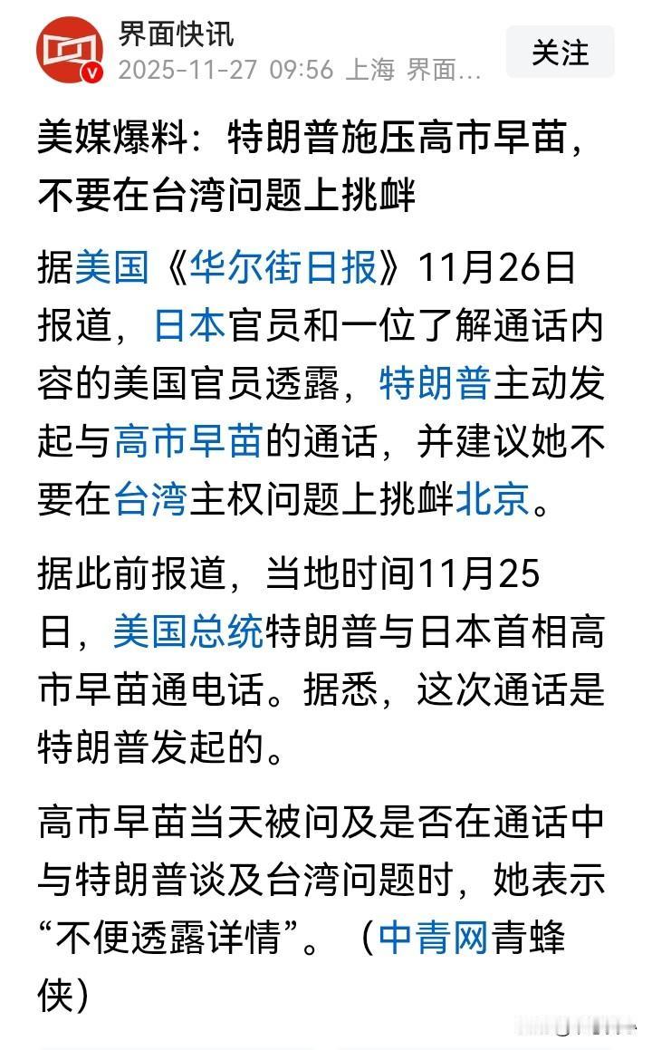 如我所料,假如川普不是急于约束高市早苗,那怎么会在和中方通话后,即要求与日本方面通话…… 或许他感受到了中方因为高市早苗错误言行的强烈愤怒和可能的强烈行动。 虽然在前段时间一次采访中,他说“有些盟友不是朋友”,暗指日本,但是,假如日本就此被狠狠教训一顿,美国也会因此丢了颜面,更可怕的是,或许高市在想的是拉美国下水…… 于是,川普和高市早苗的通话内容是可以想象的。 虽然高市早苗说细节不便披露,但是,美国媒体自然会找到!