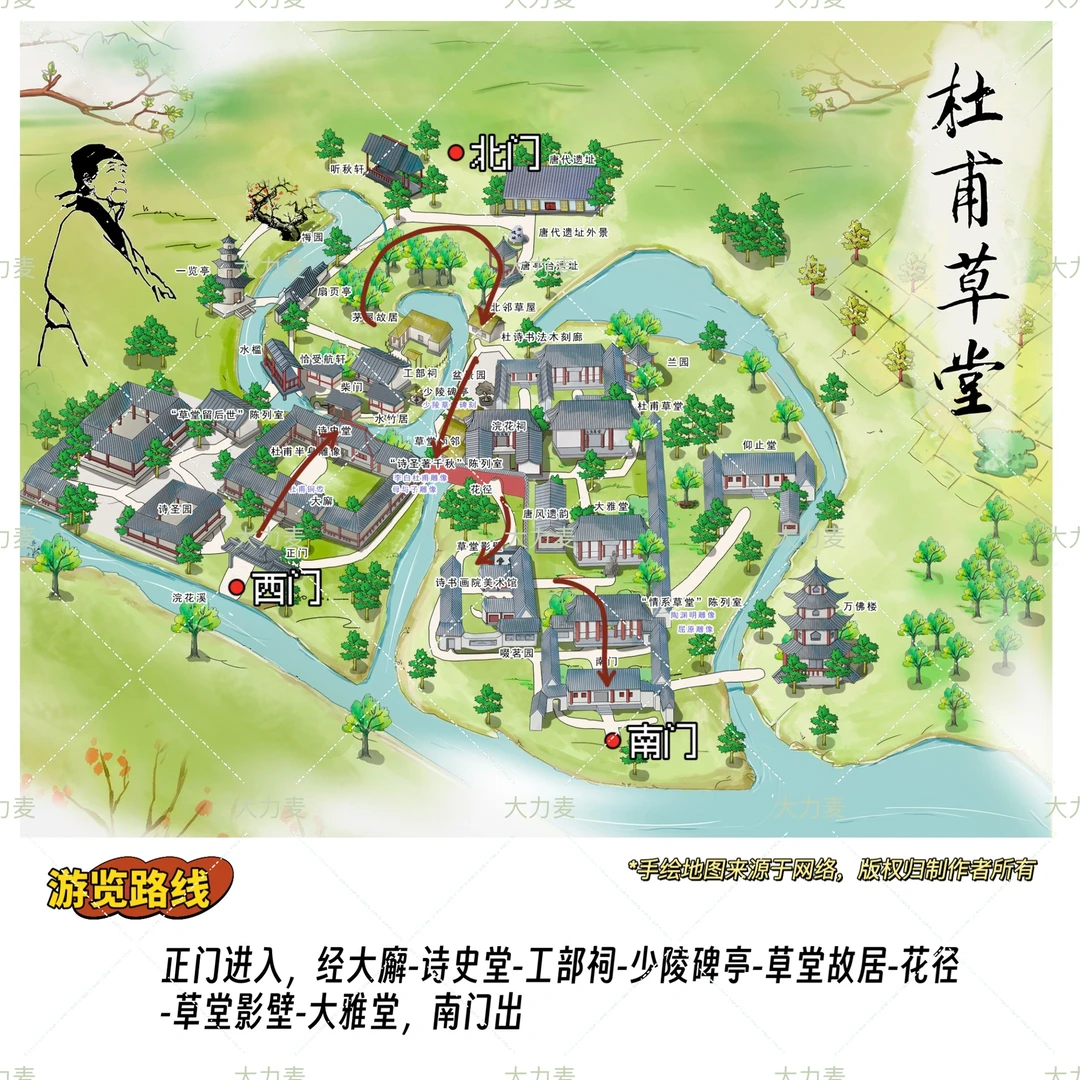 “正门进入,经大廨-诗史堂-工部祠-草堂故居-花径-草堂影壁-大雅堂,南门出”