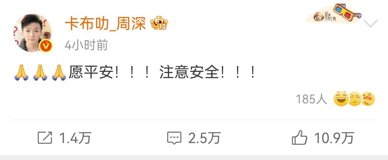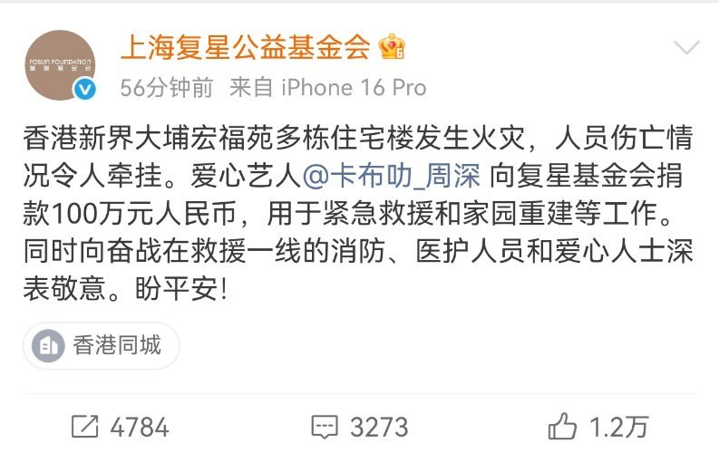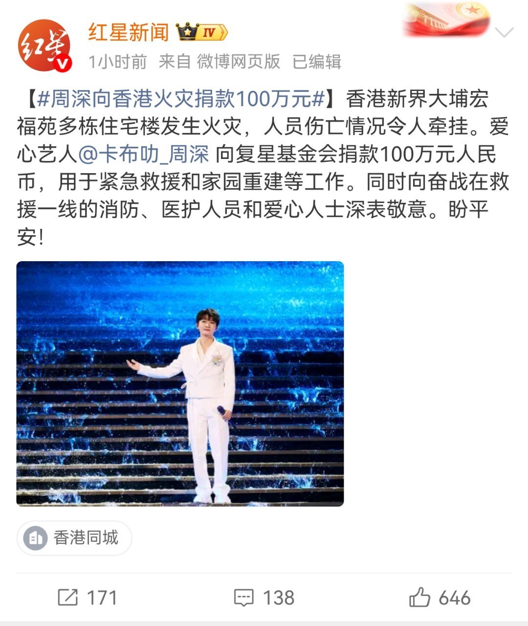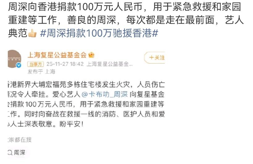 周深捐款100万 是有社会责任感的周深,会特别留意灾区需要什么,给甘肃捐赠呼吸机,给西藏捐赠糌粑,给河北捐赠照明设备,这次给香港捐了100万,灾难无情人有情,盼大家都平安!