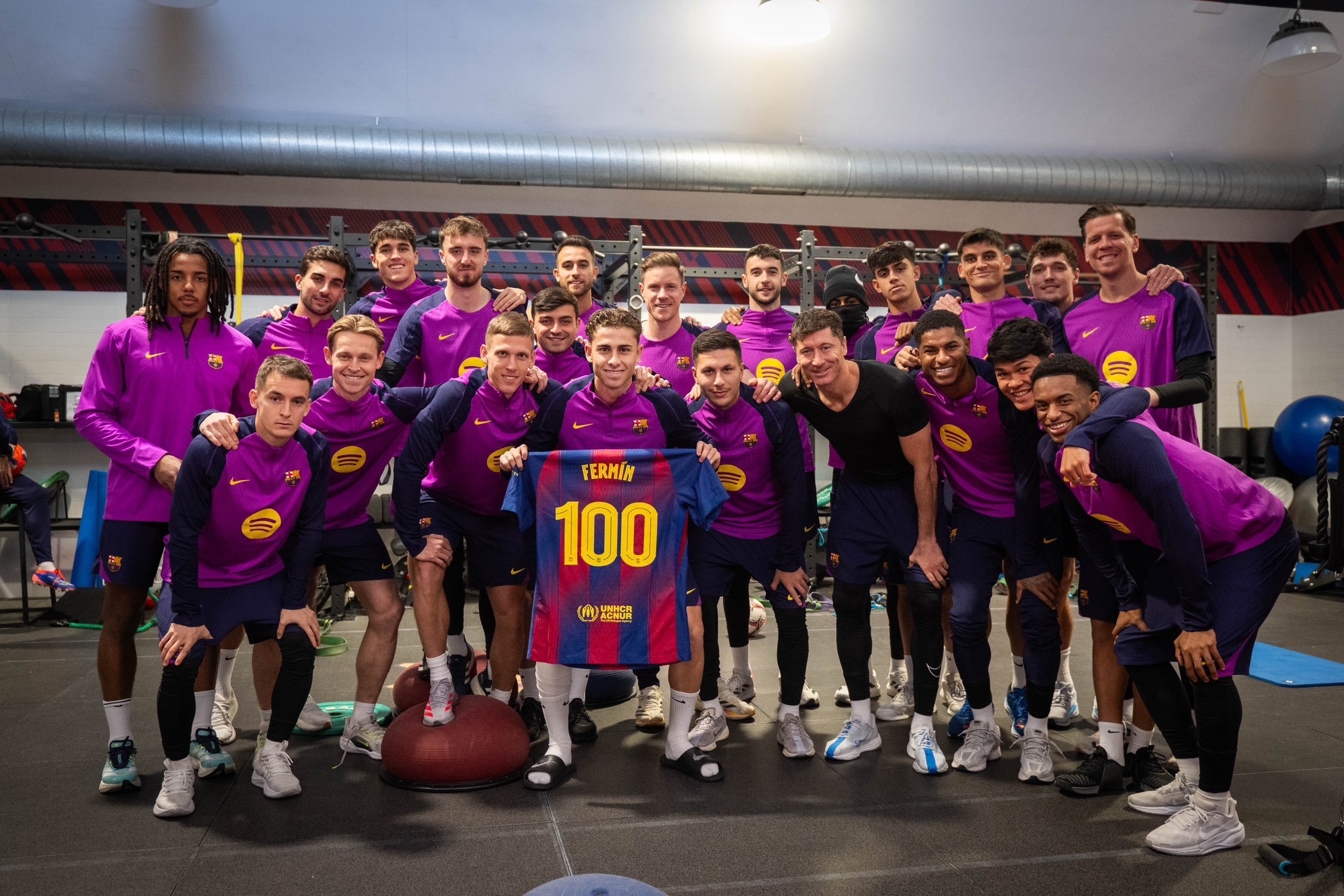 费尔明代表巴萨出战100场比赛纪念合影。❤️💙📷巴萨热点现场欧冠联赛
