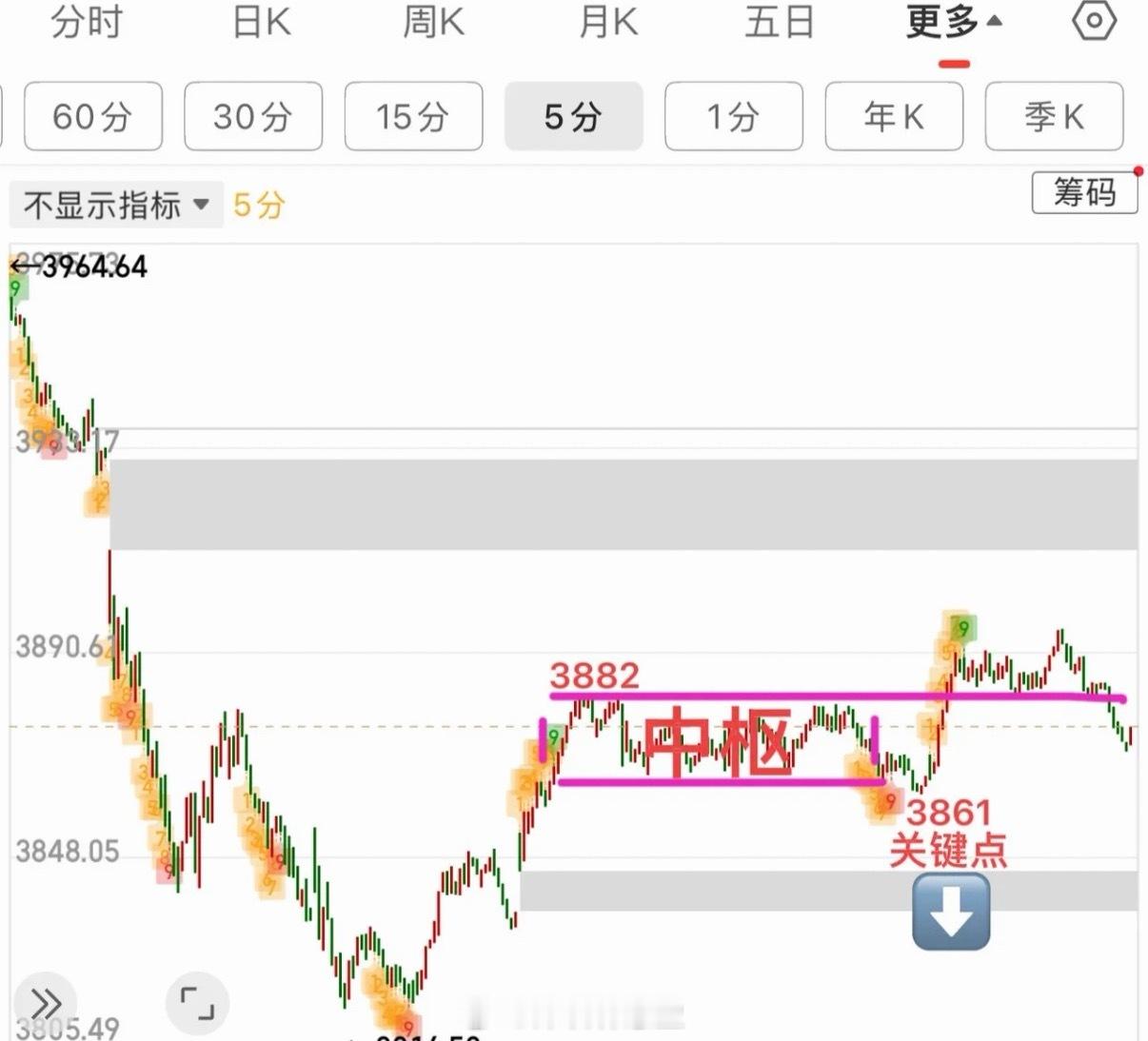 冲高回落后市展望:量能是关键,3860成重要分水岭今日大盘收出缩量小阳线,但并未改变当前市场的整体运行结构。当前行情的核心症结仍在于量能不足——缺乏增量资金进场,指数便难以获得持续向上的推动力。而量能的释放路径无非两种:要么等待外部利好刺激吸引资金入场,要么通过指数向下调整来“倒逼”筹码交换、形成自然放量。从日线级别来看,指数尚未扭转下降趋势,仍处于第二个中枢区间内震荡,今日并未做出明确的方向选择。其中,3860点是关键支撑位:若该点位不被有效跌破,市场或能维持强势震荡格局;一旦失守,则可能继续向下考验3816点支撑,甚至不排除创出新低的可能。不过,即便指数再下探也无需过度担忧,反而可将其视为布局机会——尤其是创出新低时,市场更容易出现背驰或底背离信号,这往往是阶段性底部的重要特征。此外,从均线角度观察,明日5日均线大概率走平,短期走势可重点关注5日线得失:若跌破5日线,指数大概率会向前期低点靠近。