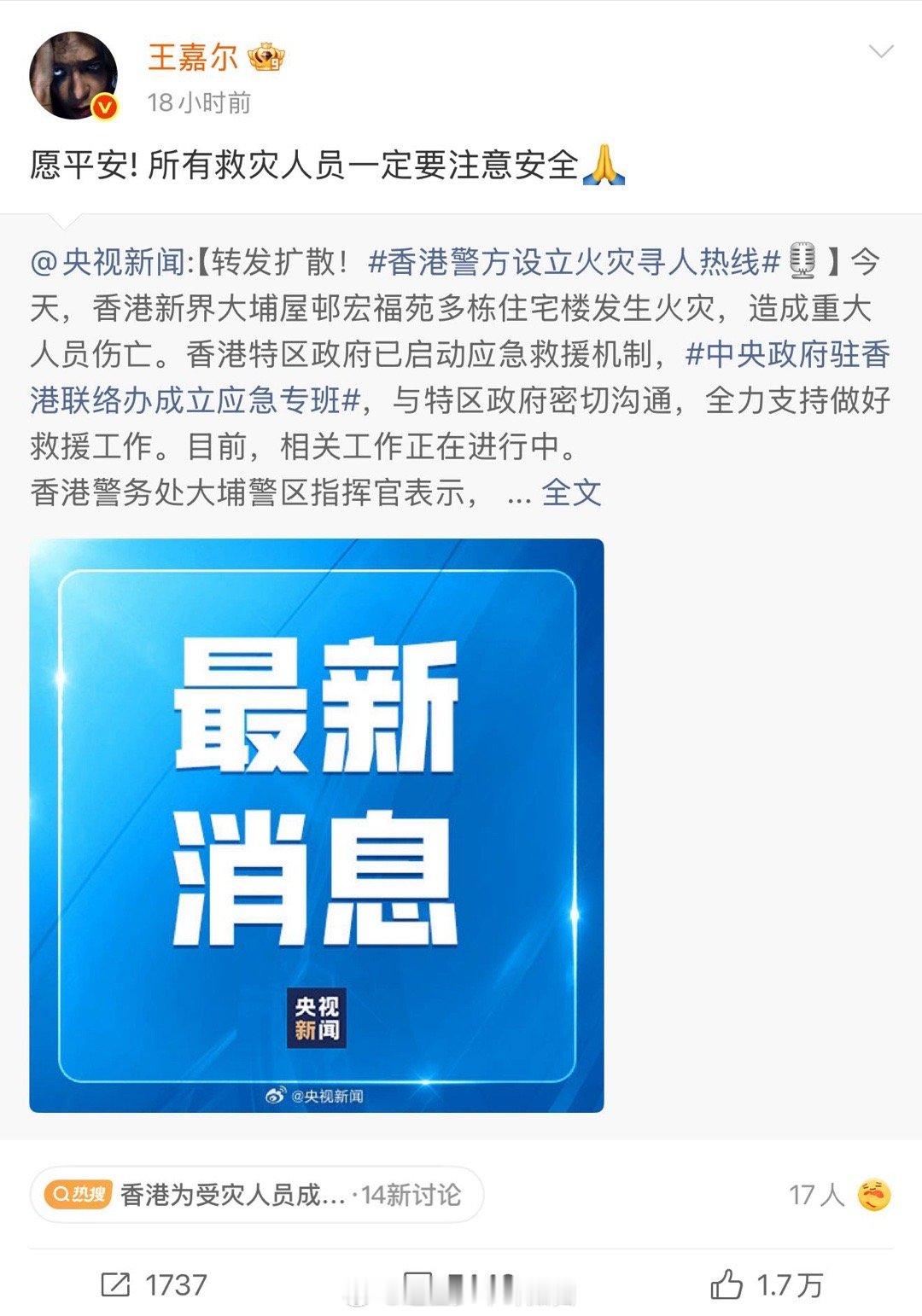 王嘉尔为香港同胞捐款 王嘉尔少说多做的态度太圈粉!直接捐款100万港元用于香港火灾救援,用实际行动传递社会正能量。这样的艺人值得追随,愿所有同胞平安,救援人员凯旋归来!