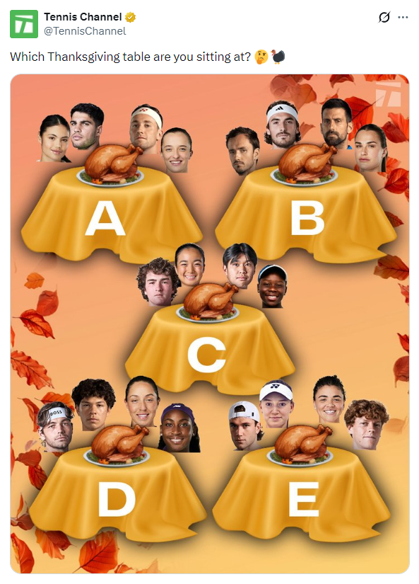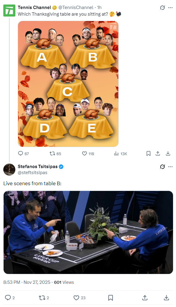 笑死!Tennis Channel感恩节玩梗,让球迷来选入座哪一桌。结果西西帕斯本尊接梗,搬出了他和梅总的经典表情包。久违的一份梅西糖啊,两个人排名越糊,吃起来越甜是怎么回事呢