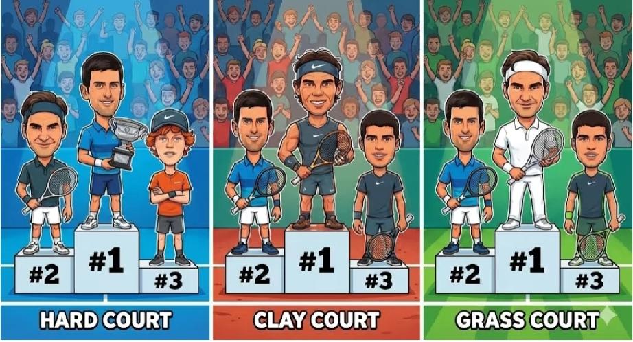 有体育博主排出了网球三大场地上历史最强的三位球员,这样的排名你认可吗? 硬地:1、德约2、费德勒3、辛纳。 红土:1、纳达尔2、德约3、阿卡。 草场:1、费德勒2、德约3、阿卡。 …… 或许,在这三个场地的排名里面,也就红土的排名争议声音相对少一点,其他两个场地肯定会有比较多的争论。比如说硬地上巅峰德约和现在的辛纳谁更厉害一点?比如说草地上巅峰纳达尔和阿卡谁能排名屈居费德勒、德约之后?