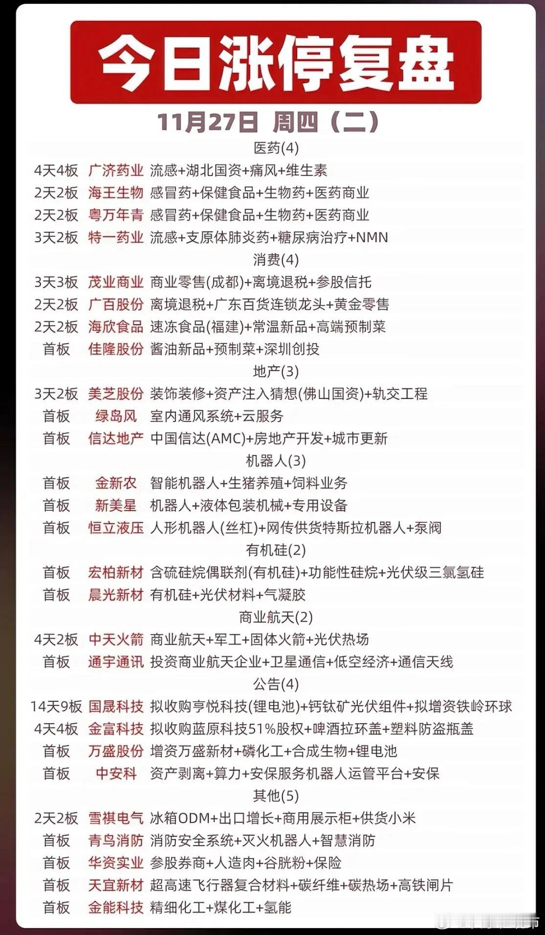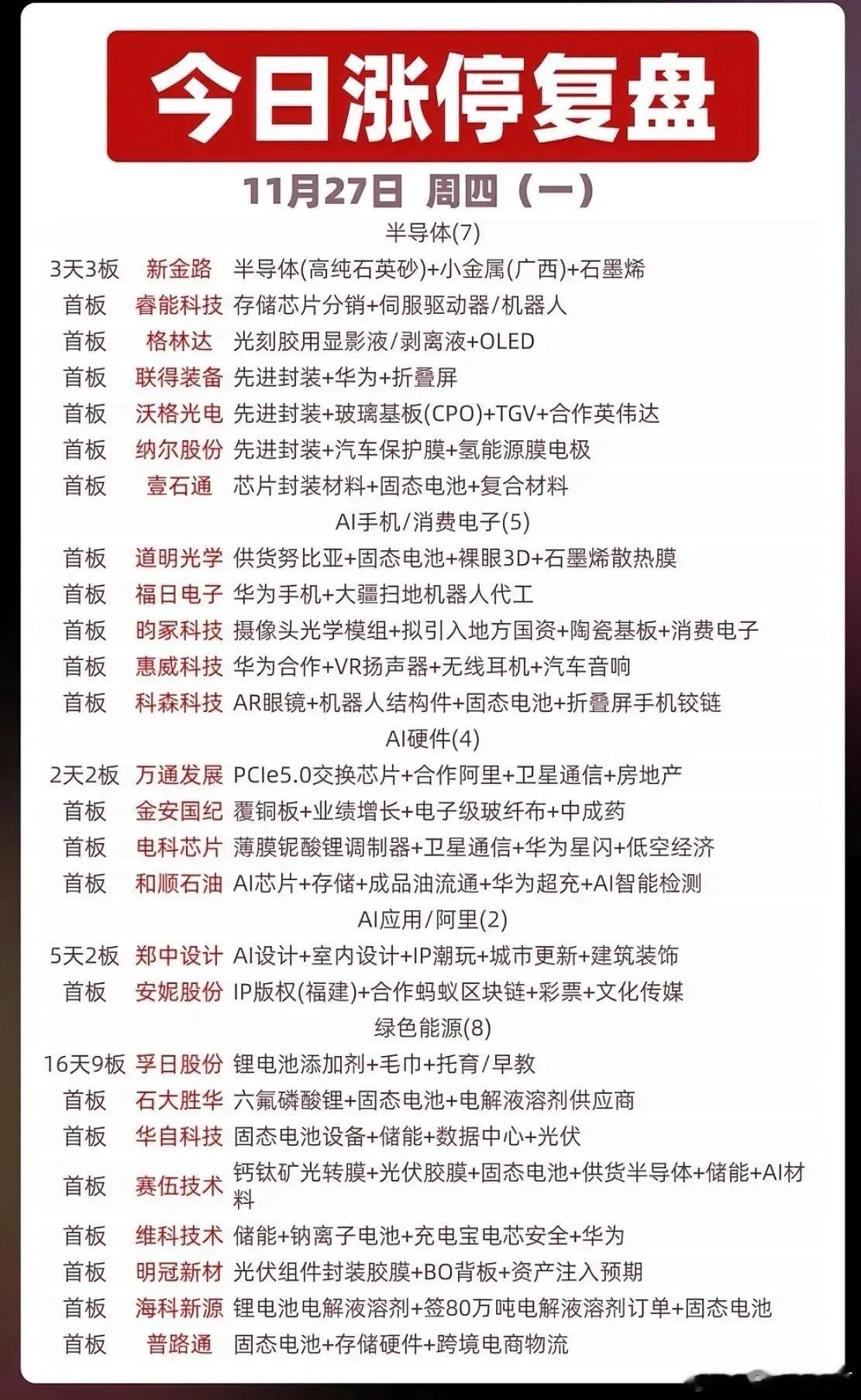 11月27日涨停复盘:市场热点板块深度解析从今日市场表现来看,多个板块呈现结构性活跃,资金围绕半导体、绿色能源、AI硬件及医药等主线进行布局。半导体板块今日表现亮眼,板块内多只个股涨停。在先进封装、光刻胶等细分领域尤为活跃,反映出市场对半导体产业链国产化进程的持续看好。随着人工智能、智能驾驶等新兴技术对芯片算力需求的不断提升,半导体产业长期发展潜力依然可观,预计相关细分领域仍将维持较高市场热度。绿色能源领域同样掀起涨停潮,特别是固态电池、光伏材料等方向表现突出。在“双碳”目标持续推进的背景下,新能源技术革新与产业化应用仍是市场关注焦点。随着储能、钠离子电池等技术的不断突破,该板块具备中长期成长空间,但需注意技术路线演进中的波动风险。AI硬件与消费电子板块热度不减,从AI手机到AR眼镜、伺服驱动器等,显示出人工智能技术与终端硬件融合的加速。在AI应用场景持续拓展的驱动下,硬件创新周期有望延续,但投资者需关注技术落地进度与产业链竞争格局的变化。医药板块受流感季节等因素催化,连续多个交易日表现活跃。感冒药、保健食品等细分方向受到资金关注,反映出市场对公共卫生事件的敏感性。医药行业兼具防御与成长属性,在人口老龄化与健康消费升级背景下,中长期发展逻辑依然稳固。此外,商业航天、机器人、有机硅等新兴或细分板块也有所表现,显示出市场资金在寻找多元化投资机会。整体来看,当前市场仍以题材轮动为主要特征,投资者应保持理性,把握产业趋势与政策导向,注意分散风险。