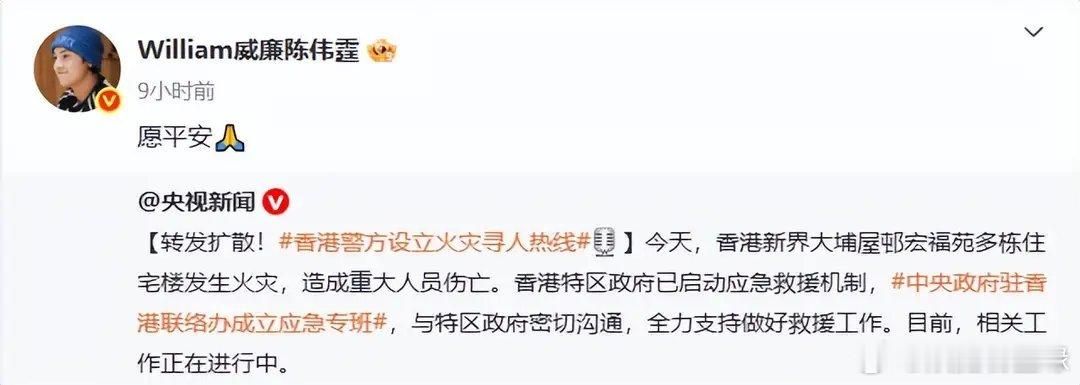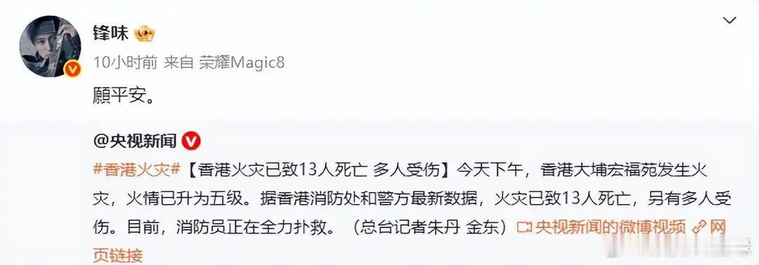 11月26日,香港大埔宏福苑发生火灾,造成多人伤亡。香港警方和消防部门27日凌晨召开记者会宣布,大埔屋邨宏福苑火灾目前已造成44人遇难,45人受伤。警方已拘捕3名涉嫌误杀的男子。11月27日早上8点22分,记者在香港大埔宏福苑火灾现场看到,经消防队彻夜灭火,少数楼层房间内部有火焰跳动,现场高楼浓烟减退,火势基本得到控制。灾情发生后,杨幂、谢霆锋等多位明星发文,为香港受灾民众祈福。