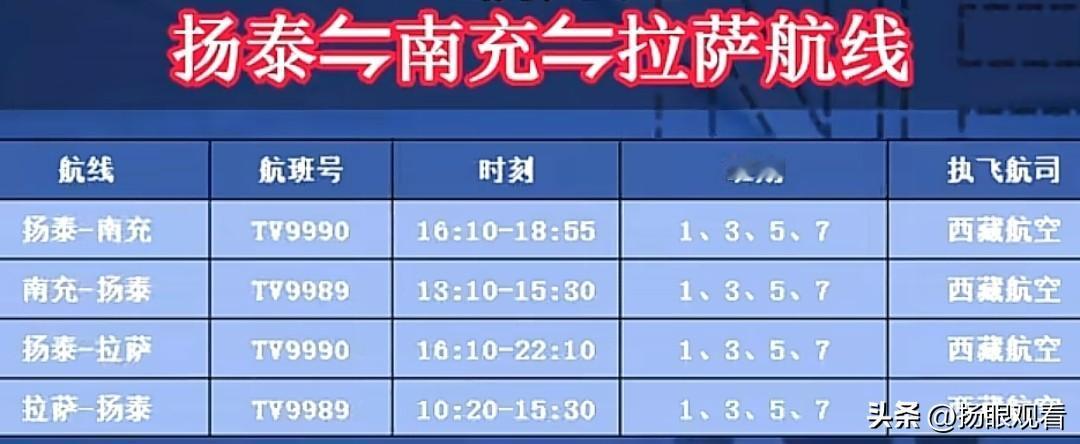 扬州人冲拉萨!12.5直飞航线开通✨ 全程无折腾太香了 扬州人狂喜!终于不用辗转转机去拉萨了👏 扬泰机场放大招,12月5日起联合西藏航空,全新开通扬泰→南充→拉萨航线,直接把“世界屋脊”拉到家门口~ 以前去拉萨,光中转就要等大半天,行李拖来拖去超麻烦,现在这趟航线直接一站式搞定!每周一、三、五、日都有航班,时间安排超贴心👇 ✈️ 去程TV9990:16:10从扬泰机场起飞,18:55先到南充歇歇脚,接着直飞22:10就能抵达拉萨,一路欣赏从江南到高原的绝美风景 ✈️ 返程TV9989:10:20从拉萨出发,经停南充后15:30准时落地扬泰,回来也不用熬夜赶路 重点是价格还超惊喜!南充到拉萨段最低才540元起,比之前中转航线划算不少,学生党、穷游党也能轻松冲~ 这趟航线不光方便去拉萨朝圣、看布达拉宫和纳木错,经停的南充也超值得逛,三国文化、特色川味美食,顺路就能解锁双城玩法 作为连接长三角和西南的空中纽带,这趟航线开通后,扬泰机场的西南航线网络更完善了,不管是旅游还是出差都超方便。想象一下,早上还在扬州吃早茶,晚上就能在拉萨看星空,这种幸福感谁懂啊! 12月想去拉萨的朋友,赶紧定好闹钟抢票啦~ 一起去感受高原的纯净与壮阔,顺便打卡南充的烟火气~