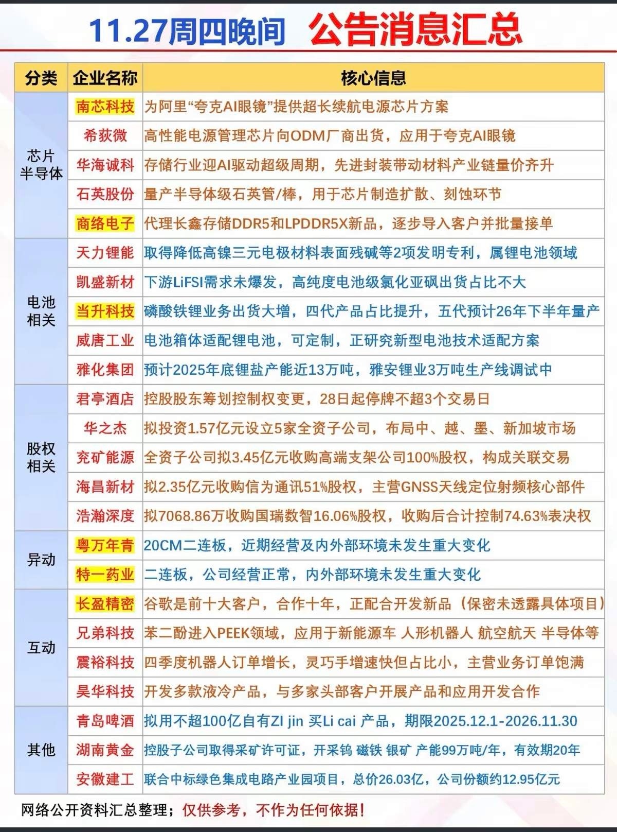 11.28周五 最新:上市公司公告汇总!24家公司发布公告!涉及控制权变更,收购资产,芯片半导体,电池相关,异动等