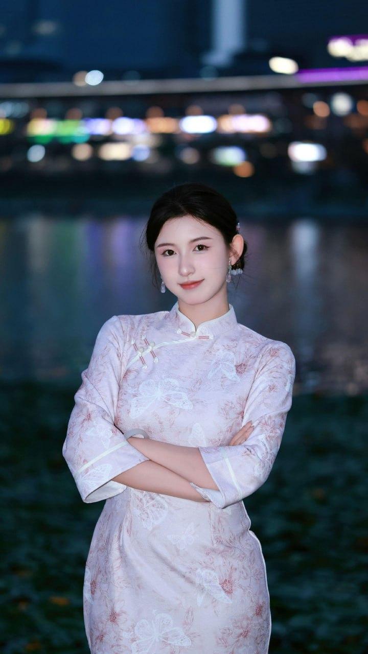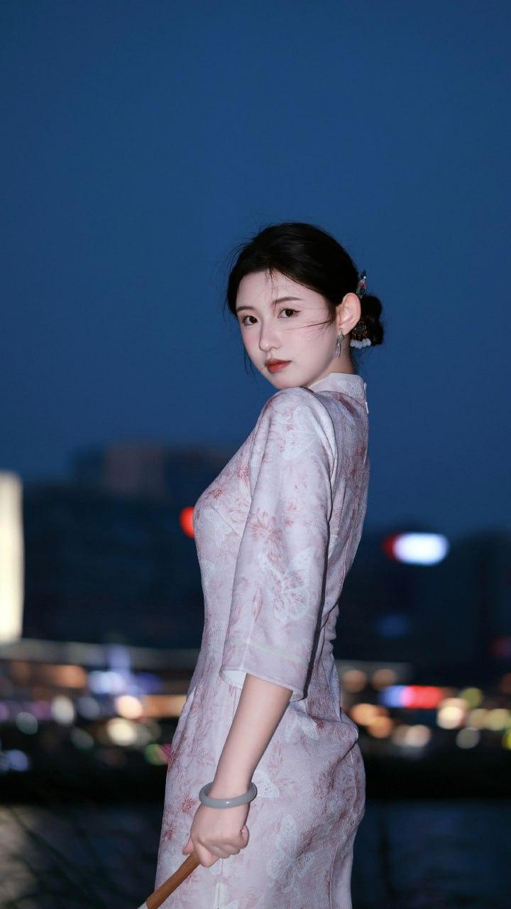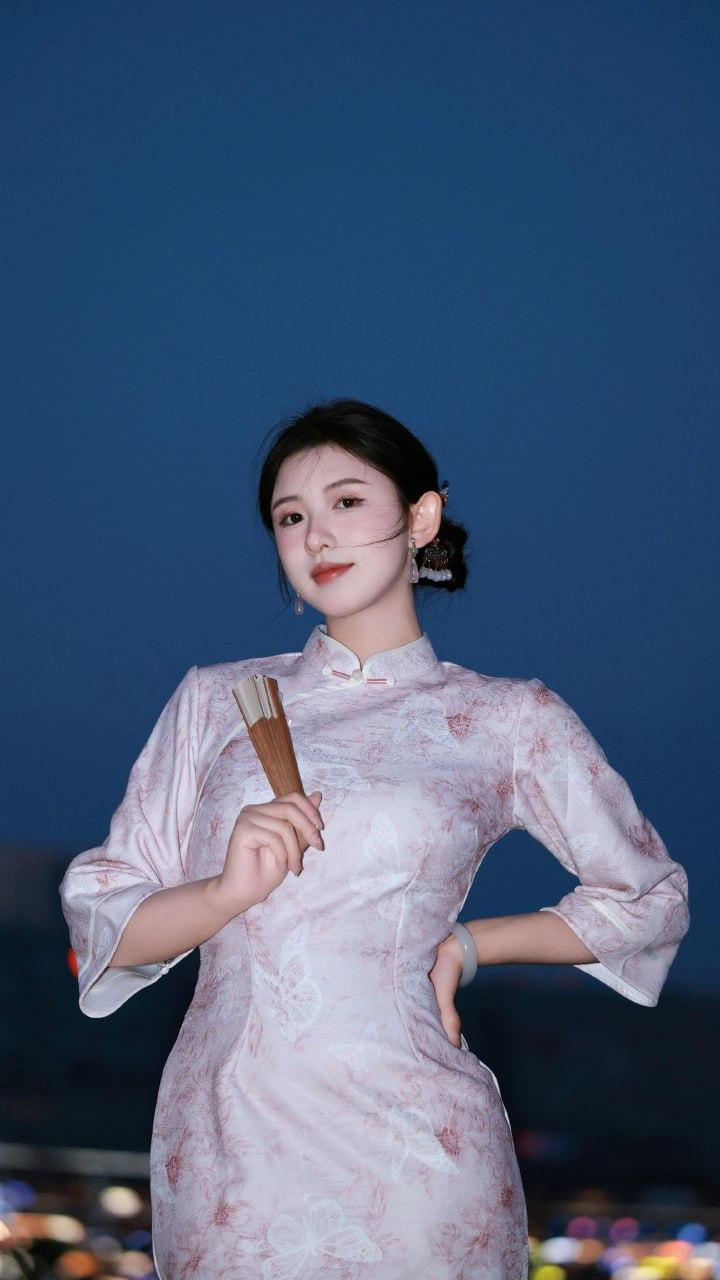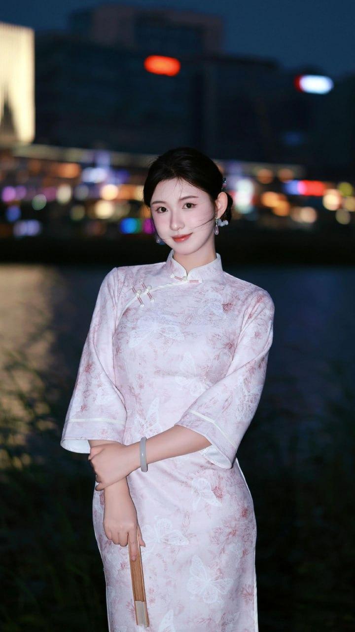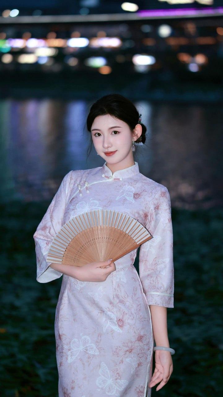夜幕下的湖畔,一位女子身着淡粉印花旗袍,优雅坐在木栈道上。 她发髻轻挽,缀着精致珠花,耳畔流苏耳坠摇曳生姿。 手中轻执一把素面折扇,唇角噙着温婉浅笑,眉眼间流转着古典韵味。 身后水光潋滟,倒映着斑斓灯火,与岸边葱茏绿意相映,宛如一幅灵动的江南夜韵图。