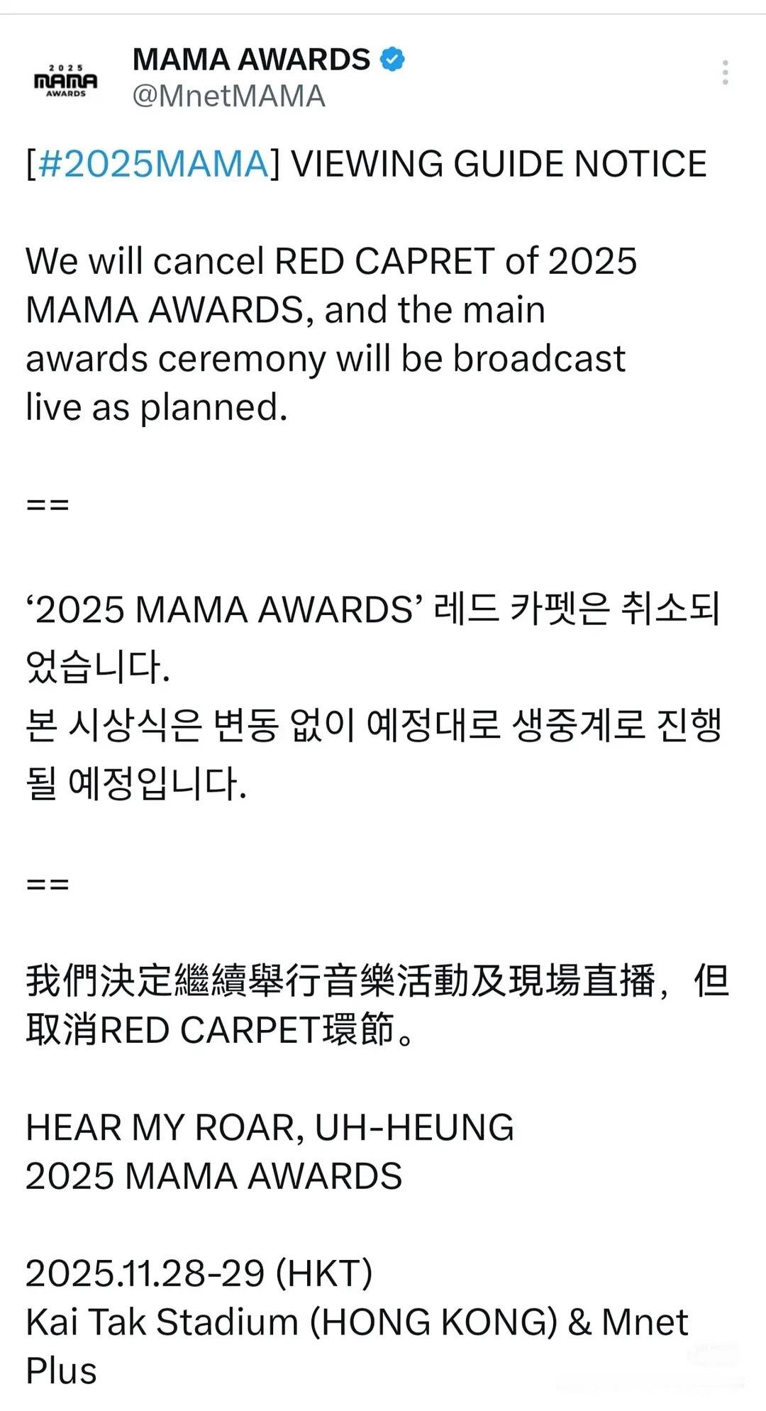 MAMA 官方发布公告颁奖礼有现场直播 但取消红毯环节MAMA公告mama红毯取消