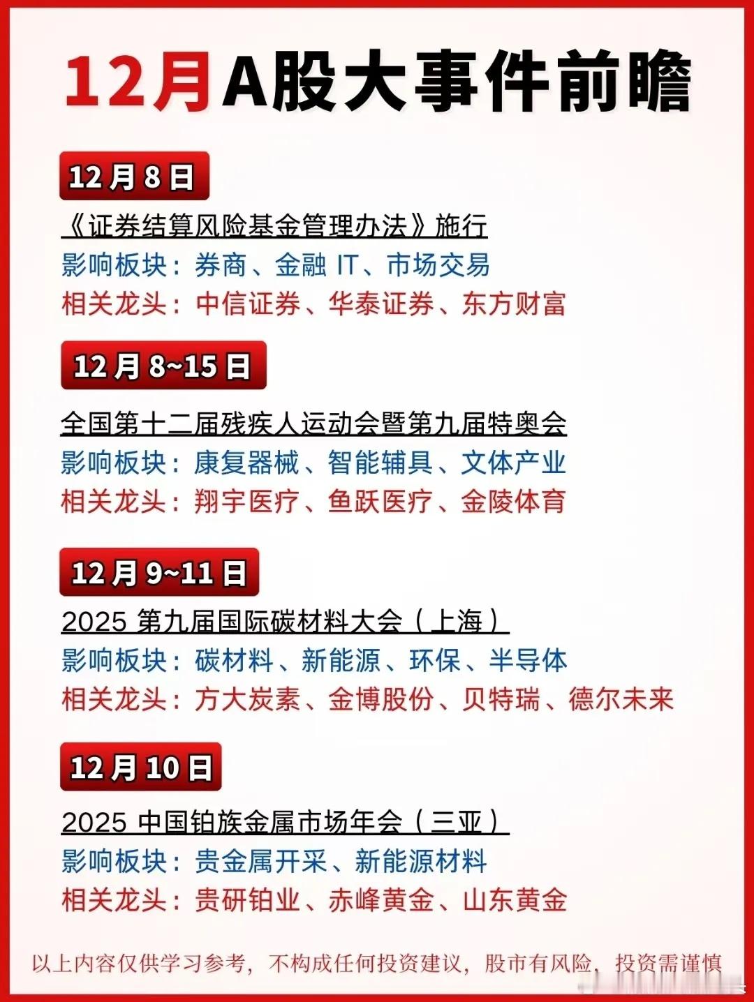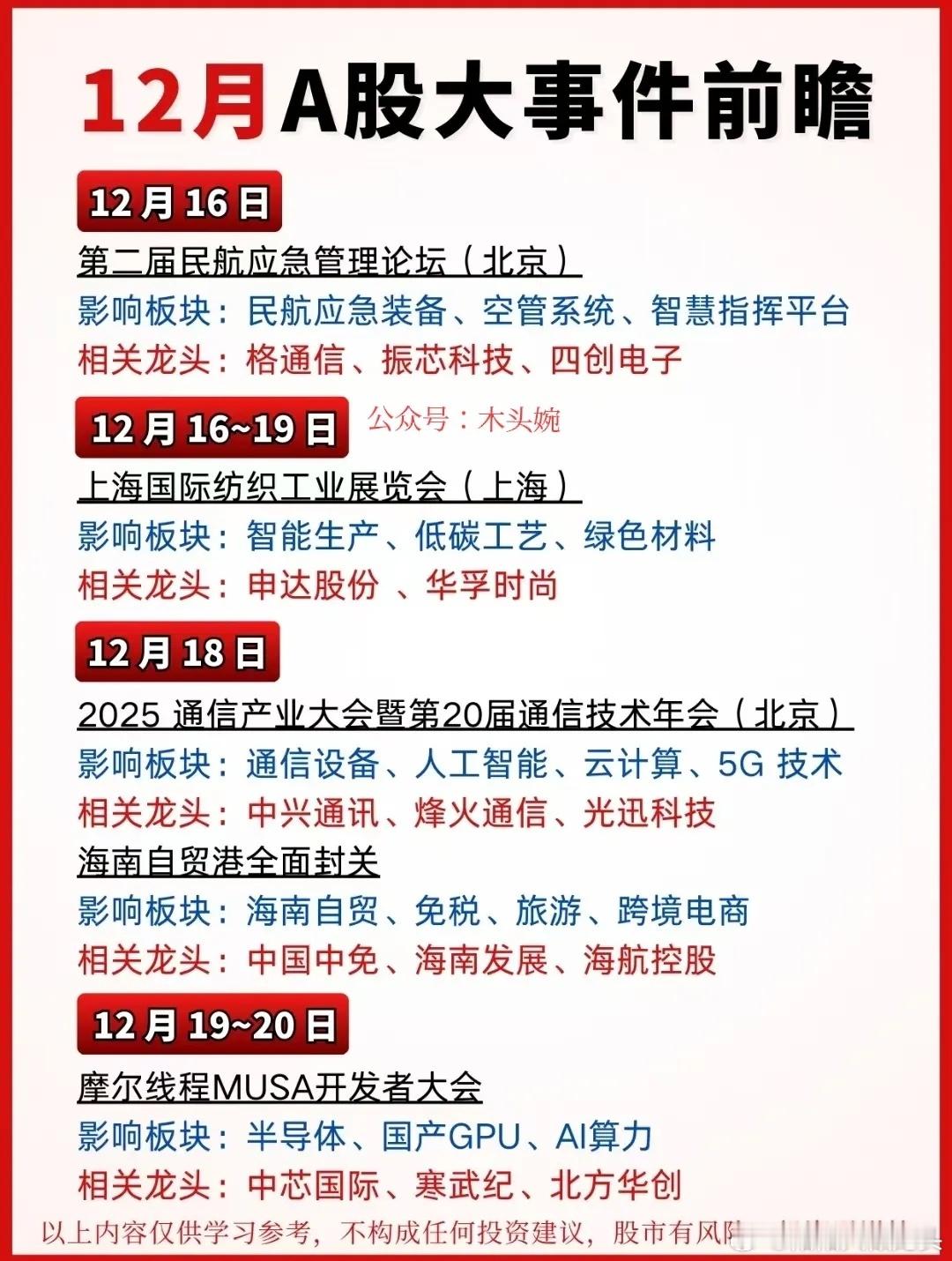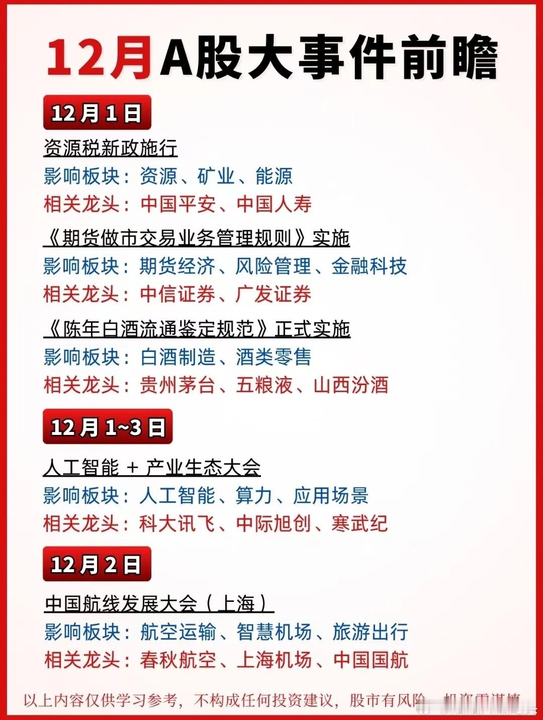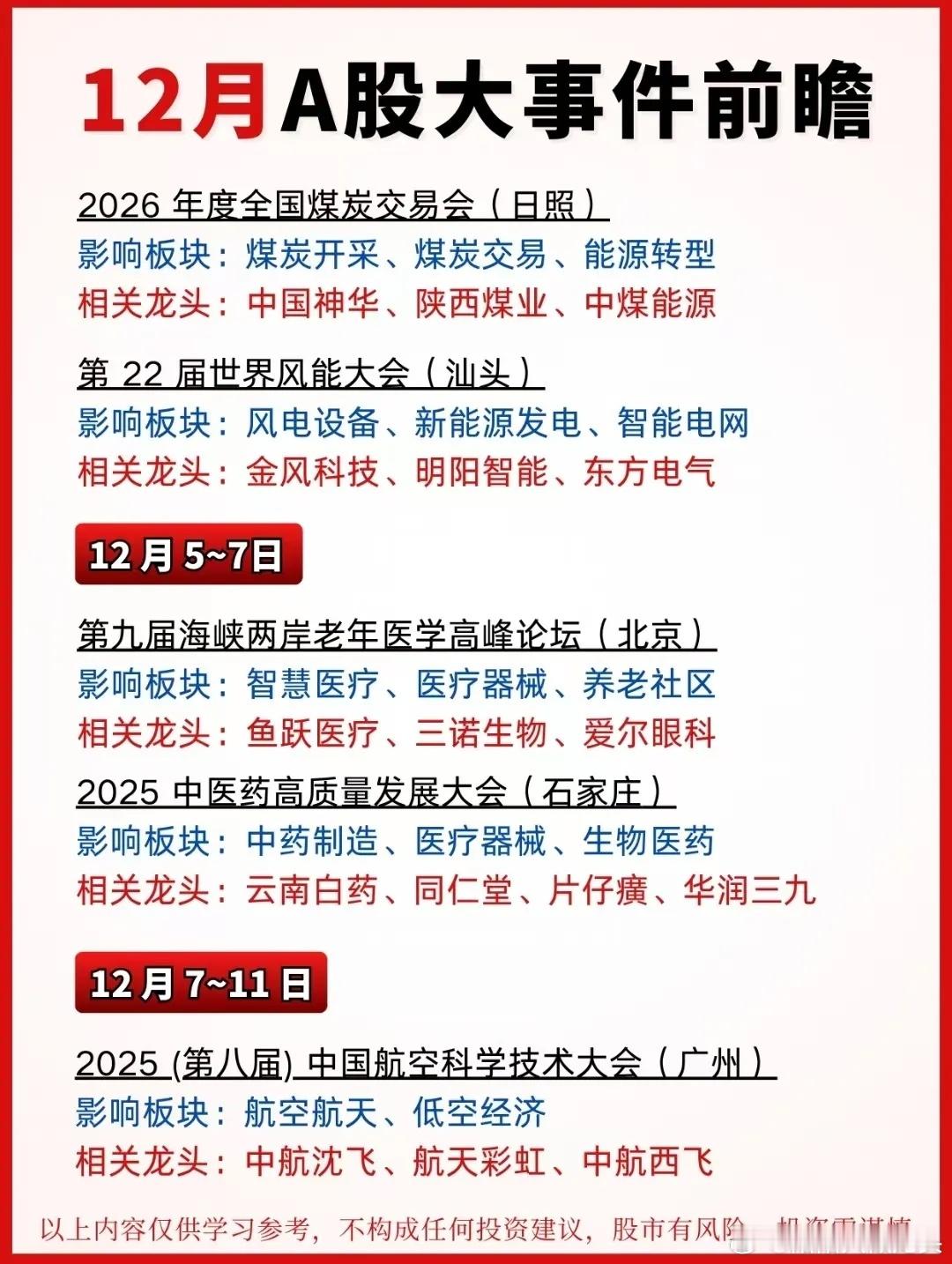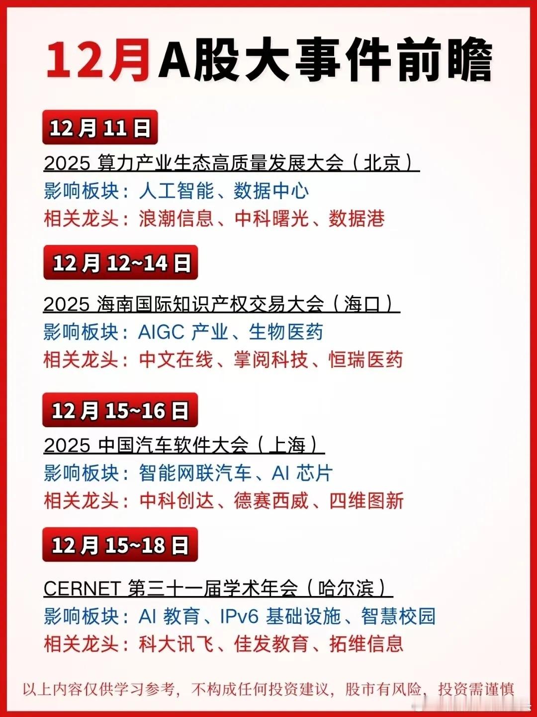 十二月重大财经事件提前看!根据公开资料显示,十二月份值得关注的财经事件有人工智能产业生态大会、大数据应用大会、产业互联网年会、算力产业大会、通信技术年会、世界风能大会、海南自贸港封关等等,相关事件题材概念龙头代表有哪些?(1)2025“人工智能+”产业生态大会由中国互联网协会主办,将于12月1日 - 3日在北京中关村举办,人工智能龙头代表有科大讯飞、浪潮软件等等。(2)2025算力产业生态高质量发展大会定于12月11日在北京举办,大会主题为“协同·跃升·赋能”。算力概念龙头代表有数据港、中科曙光等等。(3)2026年度全国煤炭交易会将于2025年12月3日 - 5日在山东日照召开,主题是保障煤炭安全稳定供应。相关概念龙头代表有陕西煤业、中国神华……理财有风险入市需谨慎!資料全网公开透明,仅供参考不能作为投资依据。股票