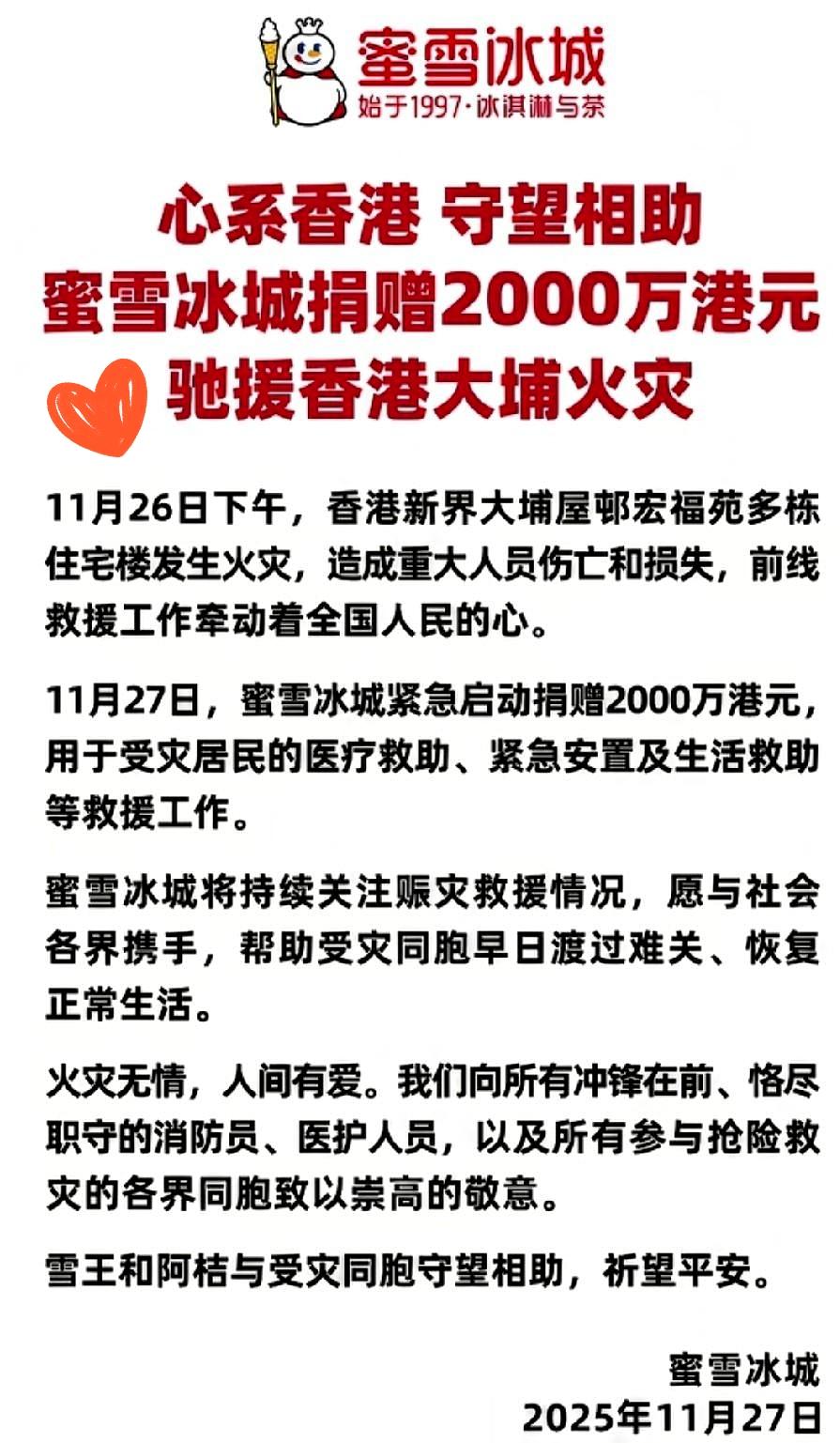 李嘉诚,马云捐款我理解,但是让人没有想到的是,你个平价的奶茶也捐这么多。 毕竟它家一杯柠檬水才4块钱,要卖500万杯才能攒够这笔钱,每一分都是咱们打工人随手买的甜蜜,攒出来的大爱。更让人破防的是捐款人署名——雪王和阿桔,阿桔可是咱们每一个消费者的代称啊。 原来最动人的善良,从不是遥不可及的大手笔,而是把普通人的支持,变成回馈社会的力量。蜜雪冰城用行动证明,平价不代表格局小,接地气才更懂人间疾苦。 这样把消费者放在心上的品牌,谁能不爱?你以后会更愿意为雪王和阿桔买单吗?