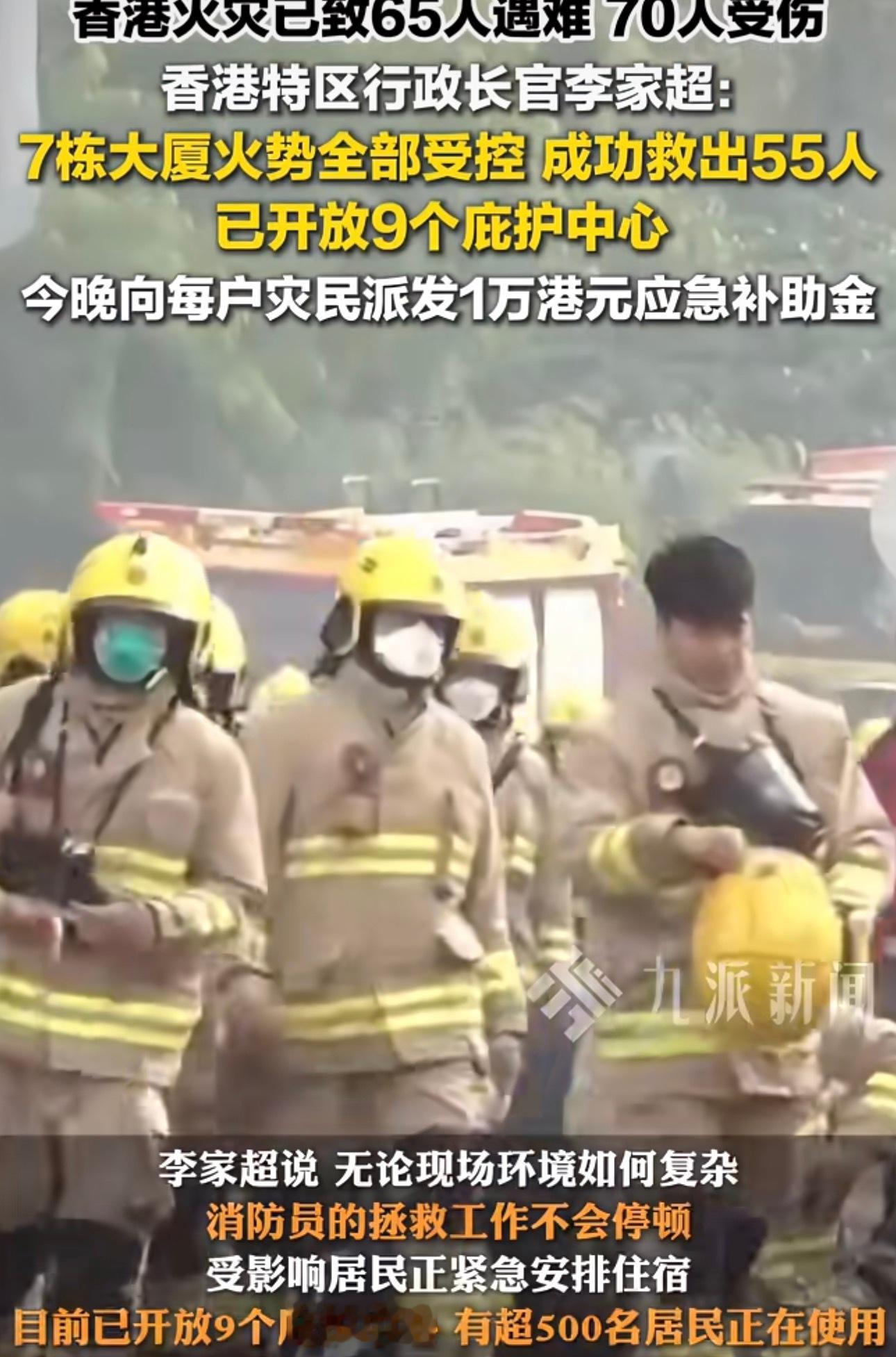 香港火灾已致65人遇难人类在灾难面前真的很无力,看到香港大火的新闻,简直不能再心痛,特别怕看到遇难人数增加!只希望那些受伤的人能稳定下来,也希望失联的能够被找到。这种时候真的说什么都挺无力的,希望大家平安🙏🏻