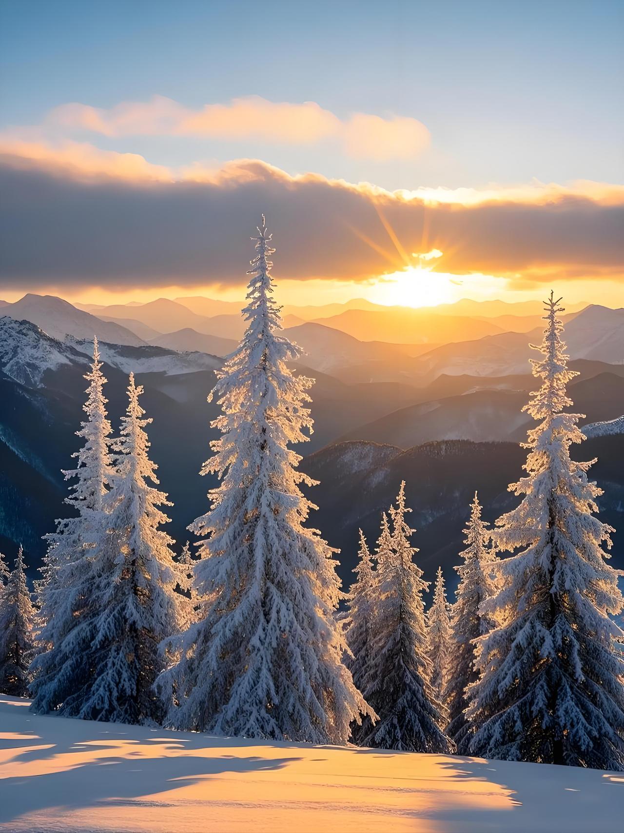 冬日照苍穹,雪松映山麓。
