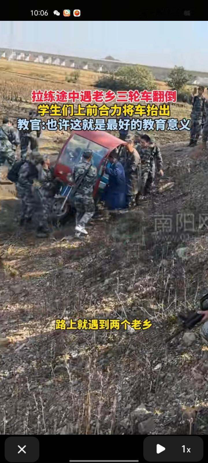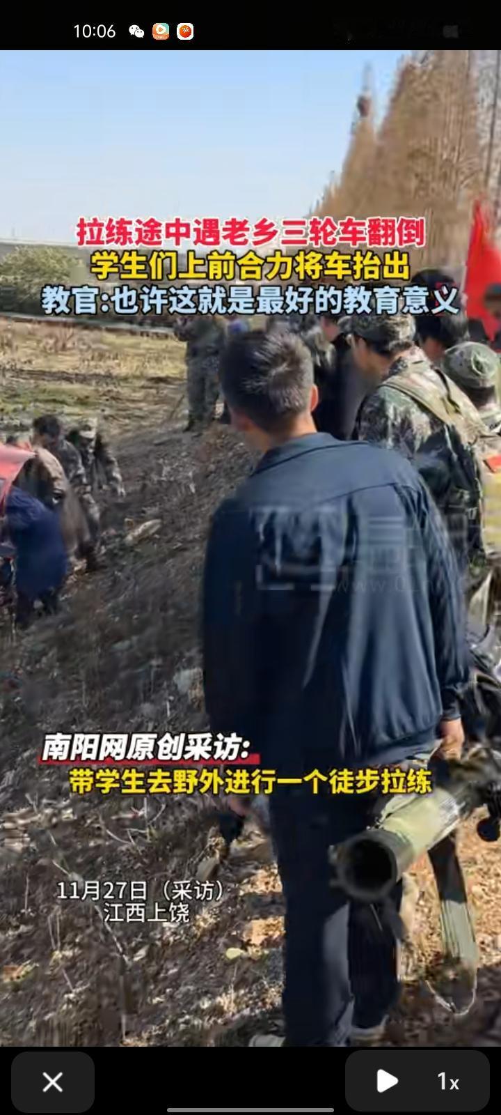 11月26日,上饶市鄱阳县。教官带学生去野外进行徒步训练,途中遇到老乡的三轮车翻倒。了解情况后,学生们下去把车抬出。之后,老乡跟他们说感谢的话,学生们比较开心,这就是教育的意义。