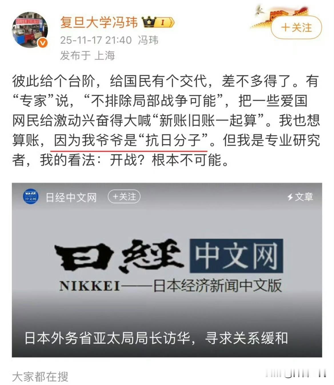 日本拨款130亿日元,在台湾培养媚日人士?要不要调查一下日本在中国大陆花了多少钱,培养了多少媚日人士,尤其是中国的大学、媒体、金融圈子。 比如这位复旦大学的冯教授,高市早苗妄言之后,他就出来替日本说好话了,还称自己的爷爷是“抗日分子”。 众所周知,“抗日分子”这个称呼只会从日军和汉奸的嘴里说出来,我们老百姓都称为“抗日英雄”。 在中国的各大高校中,冯教授这样的人数不胜数,从2015年到2024年,日本在中国大陆花了超过6000亿日元,主要就是培养各路亲日人士,让他们替日本说好话。 这些人会潜移默化的影响中国的年轻人,对中国的危害不可估量。