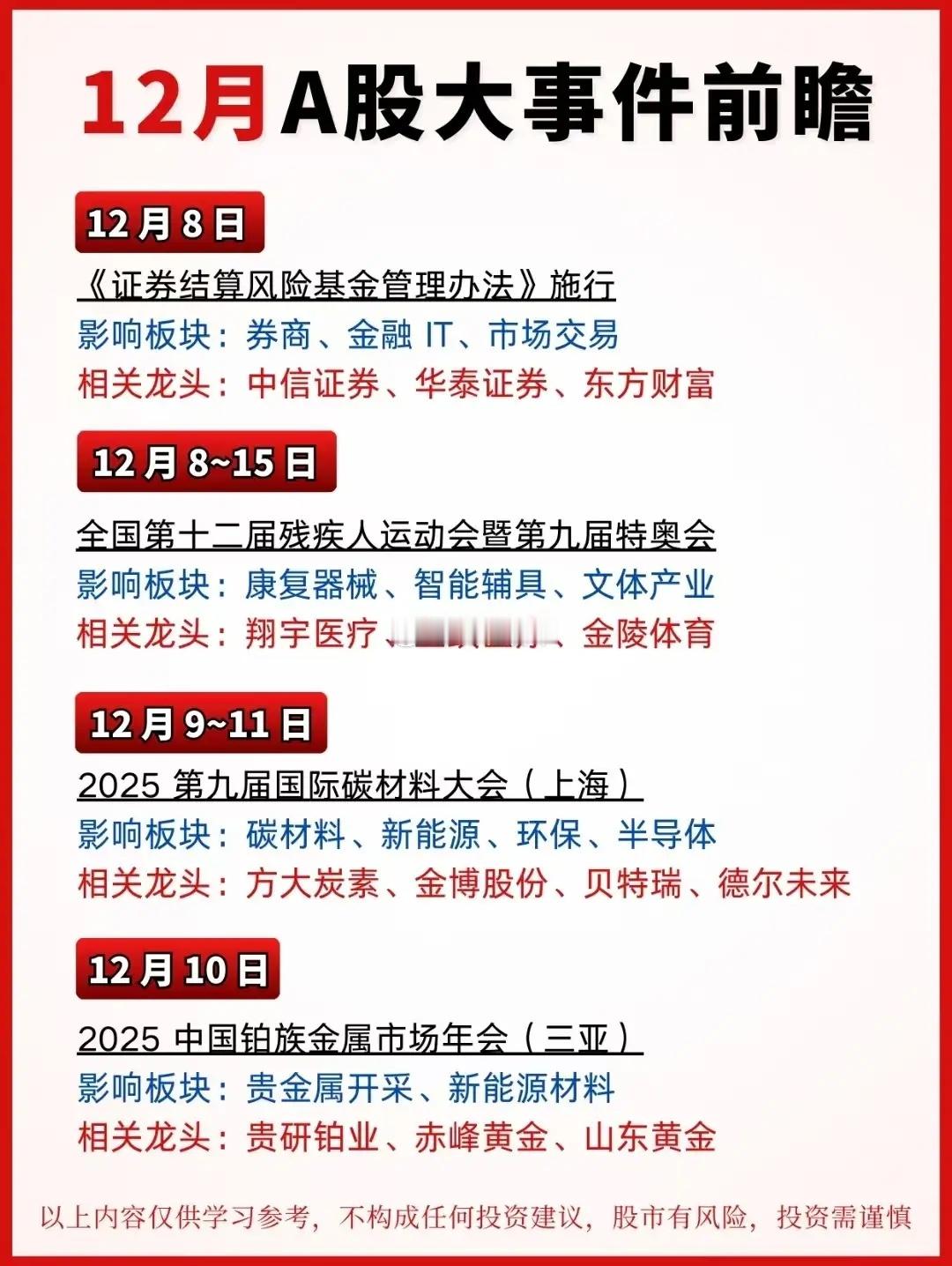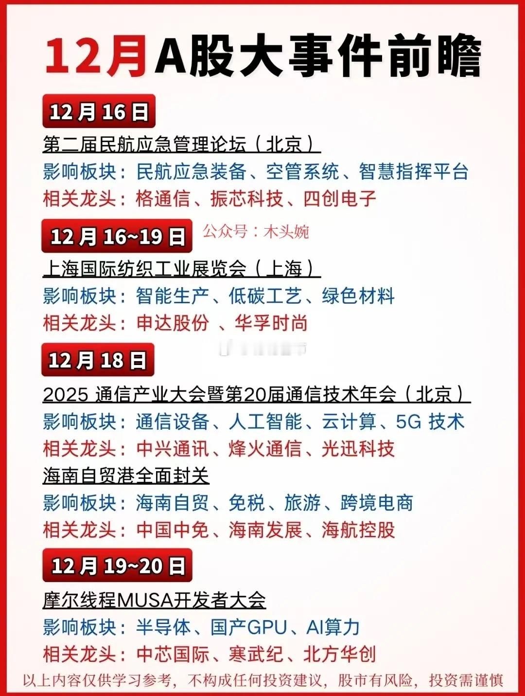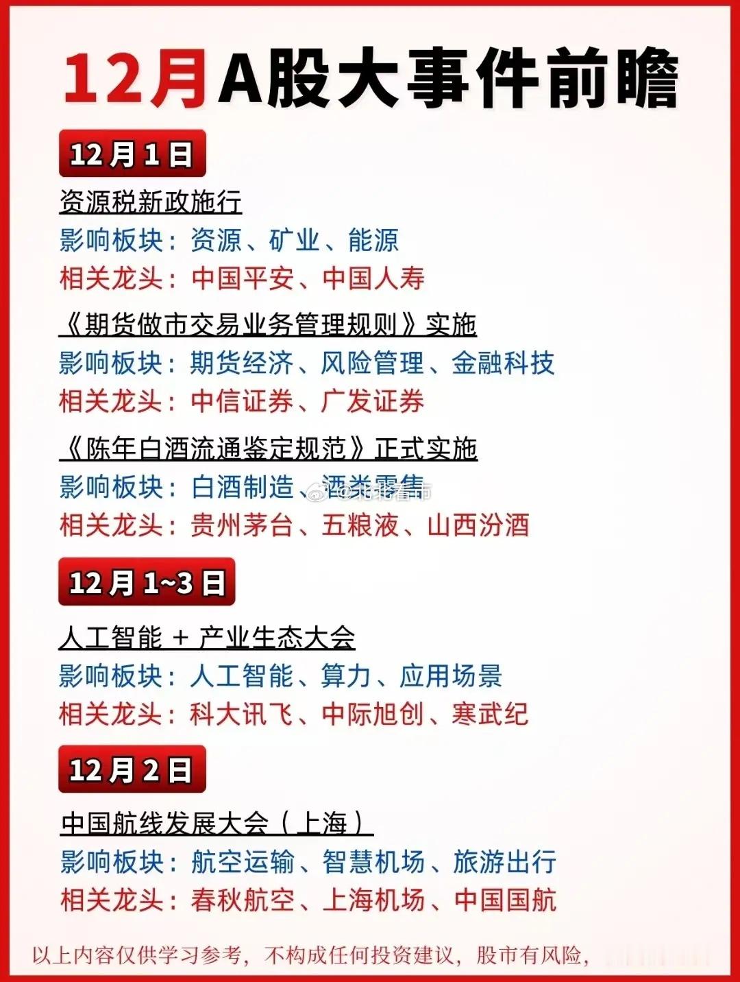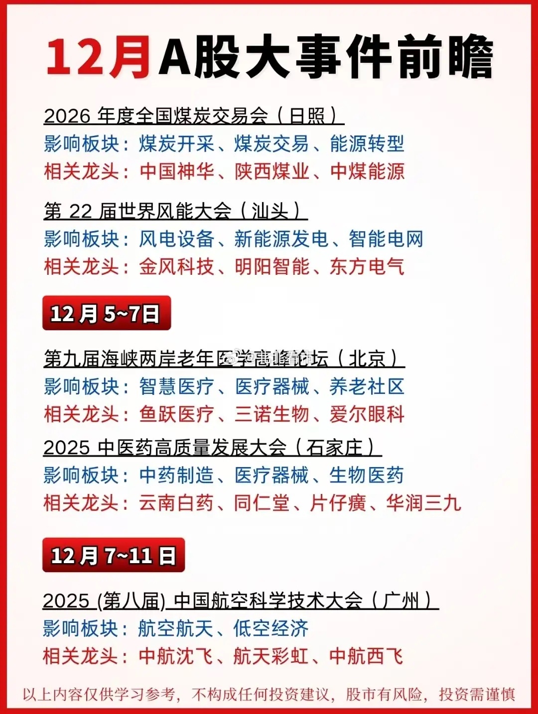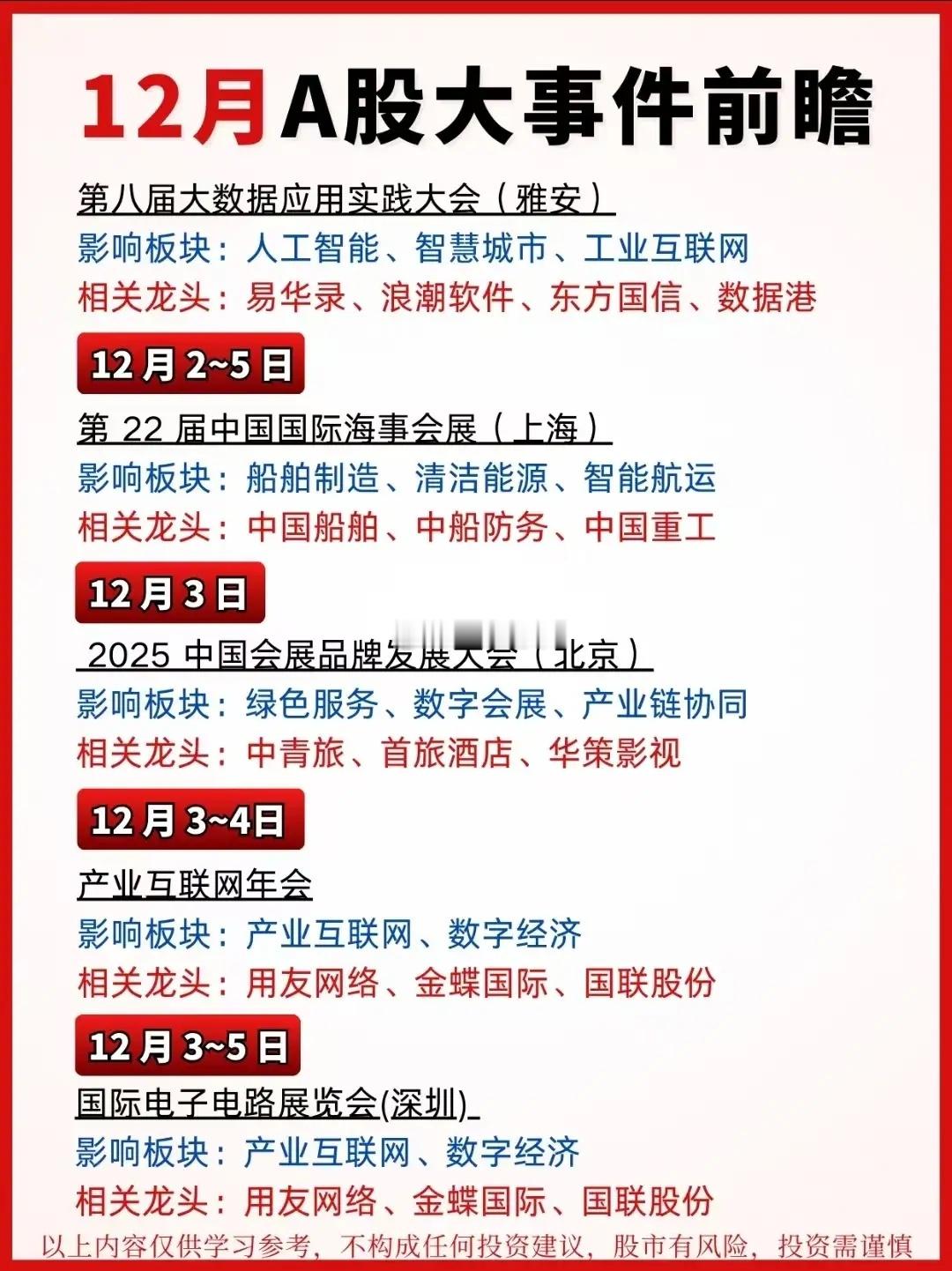 十二月重大财经事件提前看!根据公开资料显示,十二月份值得关注的财经事件有人工智能产业生态大会、大数据应用大会、产业互联网年会、算力产业大会、通信技术年会、世界风能大会、海南自贸港封关等等,相关事件题材概念龙头代表有哪些?(1)2025“人工智能+”产业生态大会由中国互联网协会主办,将于12月1日 - 3日在北京中关村举办,人工智能龙头代表有科大讯飞、浪潮软件等等。(2)2025算力产业生态高质量发展大会定于12月11日在北京举办,大会主题为“协同·跃升·赋能”。算力概念龙头代表有数据港、中科曙光等等。(3)2026年度全国煤炭交易会将于2025年12月3日 - 5日在山东日照召开,主题是保障煤炭安全稳定供应。相关概念龙头代表有陕西煤业、中国神华……理财有风险入市需谨慎!資料全网公开透明,仅供参考不能作为投资依据。
