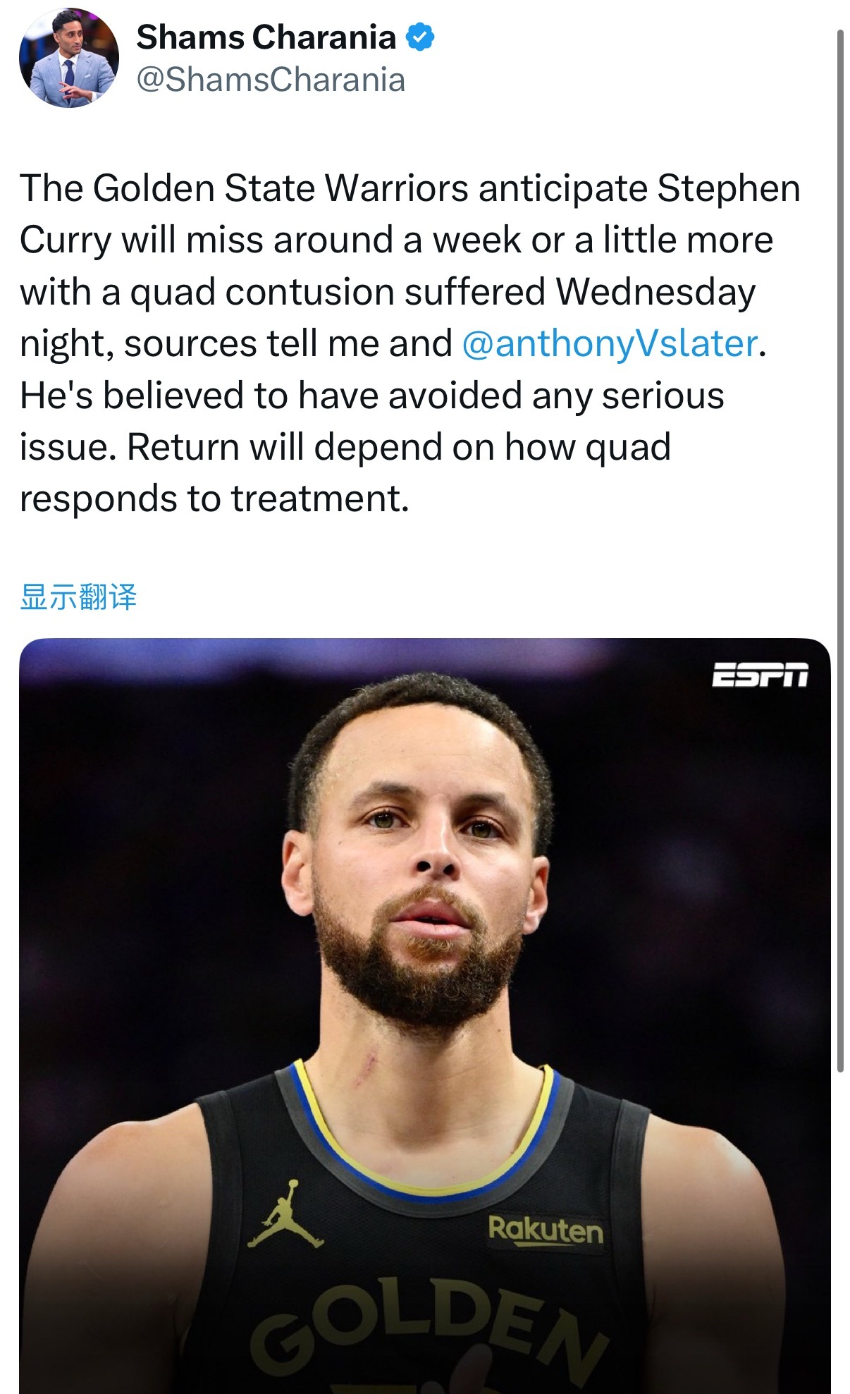 shams:库里因股四头肌挫伤将缺席一周或更长时间。据信他伤势并不严重。他的复出时间将取决于股四头肌对治疗的反应。NBA