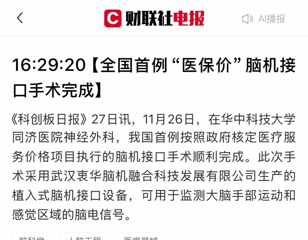 里程碑突破!全国首例医保定价脑机接口手术落地,A股概念股站上风口近日,华中科技大学同济医院成功完成全国首例按政府核定价格执行的脑机接口手术,标志着我国脑机接口技术从实验室研发正式迈向临床普惠新阶段。此次手术采用武汉衷华脑机公司的植入式设备,实现了对患者大脑手部运动及感觉区域脑电信号的高精度监测,为相关疾病治疗提供了全新技术路径。2025年堪称中国脑机接口产业“元年”,政策支持与临床突破形成双重共振,推动赛道加速崛起:- 政策持续加码:3月脑机接口项目首次纳入医保目录,7月七部门联合印发《关于推动脑机接口产业创新发展的实施意见》,11月“十五五”规划将其列为未来产业六大核心方向之一,政策红利持续释放。- 临床成果频出:阶梯医疗侵入式系统入选药监局创新器械“绿色通道”,南开大学团队完成全球首例介入式脑机接口助偏瘫患者修复运动功能,瑞金医院发布的难治性抑郁症脑机接口治疗数据显示半数患者症状显著改善,技术落地进程持续提速。A股脑机接口核心概念股梳理1. 伟思医疗:深耕非侵入式脑机接口领域,掌握脑电信号采集、机器学习解码等核心技术,累计拥有数十项相关专利,技术壁垒突出。2. 创新医疗:脑机接口赛道人气龙头,通过参股杭州博灵医疗精准切入赛道,深度绑定行业优质资源。3. 中科信息:依托科研院所强大技术支撑,布局智慧医疗与脑机接口交叉领域,技术转化能力强劲。4. 星网锐捷:新增“脑机接口”概念,旗下脑机疗愈项目已完成实验室验证,即将进入产业化落地阶段。5. 康泰医学:确认出席12月深圳脑机接口博览会,聚焦脑健康监测与康复赛道,积极拓展业务边界。6. 诚益通:确立“侵入式+非侵入式”双轨布局战略,已成功推出消费端脑机接口产品样机,多场景覆盖优势明显。7. 三博脑科:深度参与脑机接口临床应用研究与临床试验,是医疗端落地的核心参与者。8. 南京熊猫:专注脑机接口智能交互显示终端研发,为赛道提供关键硬件支持。9. 岩山科技:下属研究院实现非侵入式脑机接口游戏操控技术突破,拓展消费级应用场景。10. 狄耐克:布局脑电波交互核心技术,聚焦睡眠健康与康复器械领域,精准切入细分赛道。11. 荣泰健康:与相关机构共建“脑机交互联合实验室”,持续推进脑机融合技术在健康领域的应用落地。