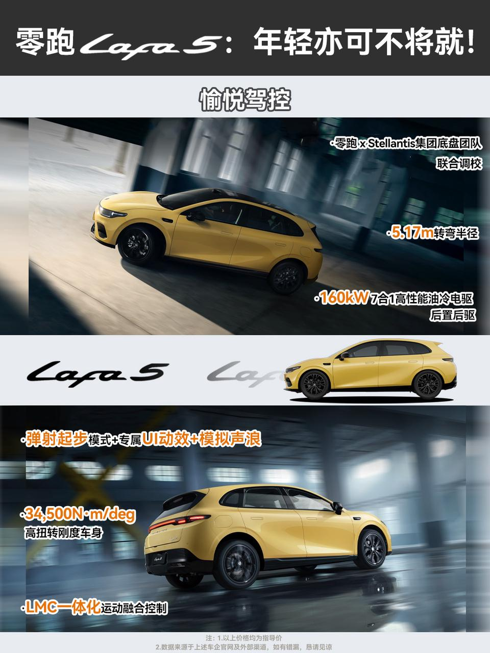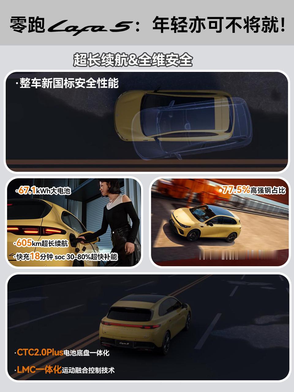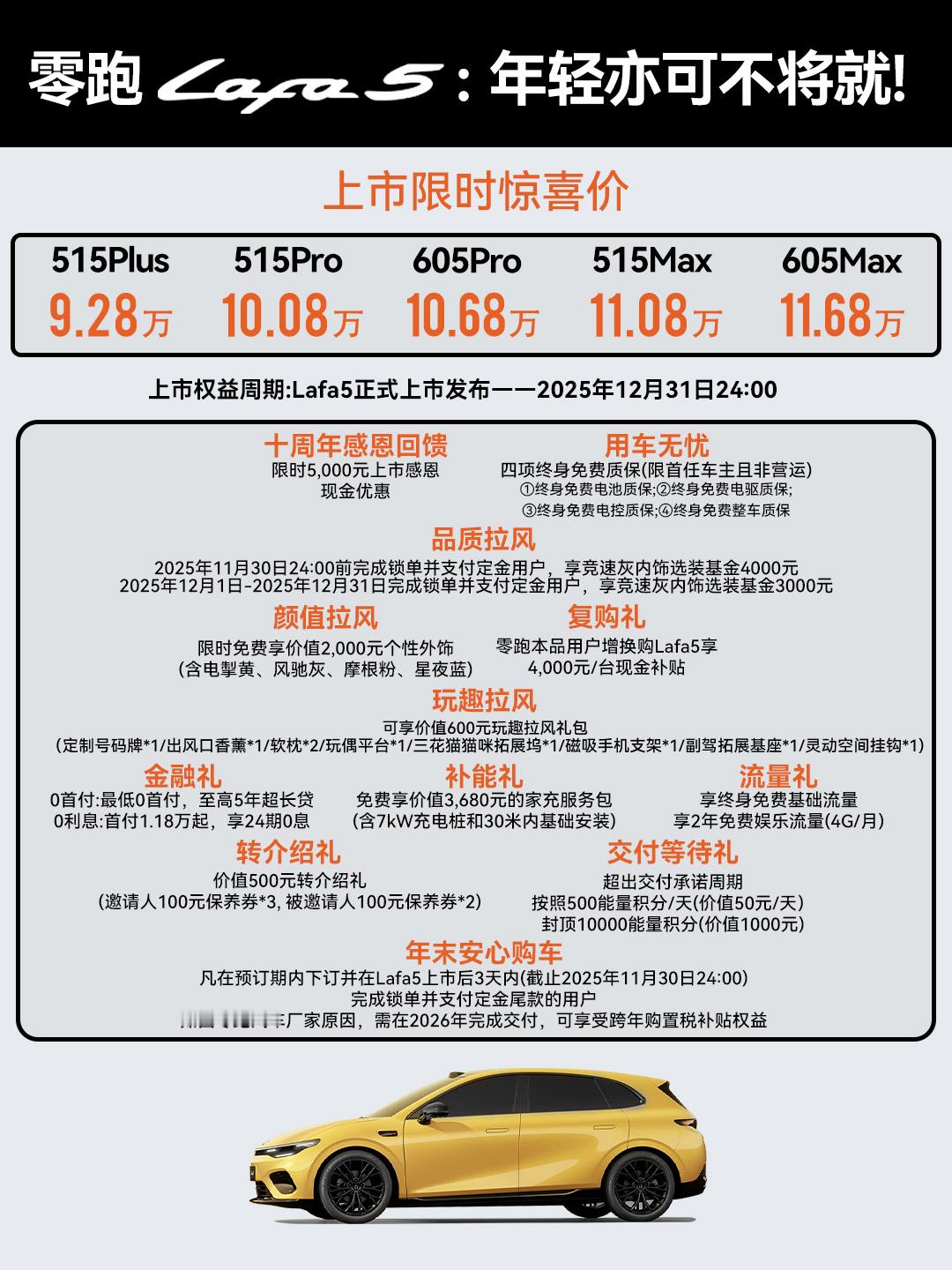 当下,10万级纯电车市场依旧一片红海,而零跑Lafa5的入场,显然没打算走常规的家用路线,而是以更年轻、更个性、更运动的调性,要给这个传统赛道注入一丝新鲜血液。单看外观,Lafa5就跳出同级别普遍卡在1750mm左右的车宽,它直接拉到1880mm,配合全系标配的19寸掠翼运动轮毂,视觉上的宽体和侵略感,是同级少有的;无边框车门+纯平车窗的组合,以往也是专属于20万级车型的配置,如今被Lafa5打成了全系标配,再加上6处小蓝灯,这种自带“潮玩属性”的设计,刚好踩中了年轻用户对“个性潮酷”的新需求,在同质化的车堆里,辨识度立住了。驾控层面,Lafa5更是同级的一把好手:后置后驱+160kW油冷电驱的组合,5米17的转弯半径,让Lafa5在城区窄路和地下车库里穿行的时足够的“从从容容,游刃有余”,再加上Stellantis欧系底盘的调校风格,过弯时的侧倾控制也更加舒适稳定,还有富有驾驶乐趣的弹射起步+专属UI+模拟声浪,都是能给年轻用户们随时随地的情绪价值和茶余饭后的谈资,也让Lafa5一下就跳出了“十万级车只能代步”的刻板印象。座舱体验上,Lafa5精准踩中了年轻用户的喜好:得房率高达86%,后排空间也相当能打;超80%的软包覆盖+OEKO-TEX环保材质,5.54m²仿麂皮超纤绒面积+Nappa全粒面真皮拼接,既照顾了年轻人对质感的要求,零甲醛座舱又规避了新车异味的痛点;1.02㎡的全景天幕配智能遮阳帘,完美兼顾科技感和实用性。续航与安全这块,也同样能打:605km的CLTC续航足够覆盖周通勤+周末自驾,18分钟30%-80%的快充效率,补上了年轻用户“不想等太久”的补能痛点;而77.5%的高强钢占比+CTC2.0电池底盘一体化结构,则是在“玩得爽”的同时,也把安全兜底做足了。 但更能体现它“年轻向”定位的,是配置上的精准划分:入门版标配基础辅助驾驶功能、哨兵模式、360°全景影像与外放电功能——这些恰好是年轻用户出行、长途自驾、露营野餐的“刚需装备”;Pro版主要在性能和舒适性配置上做了强化;顶配版则针对性强化智能化和辅助驾驶的体验,例如激光雷达、高通8295芯片以及城区NAP等等,以满足不同人群的用车需求。本质上,Lafa5的出现给10万级纯电市场弄了个“新选项”,它不走寻常路,而是用“个性设计+运动驾控 + 智能下放”,让年轻人可以不必再在“实用”和“喜欢”之间做取舍,我就问一句,评论区的朋友们,你心动了吗?