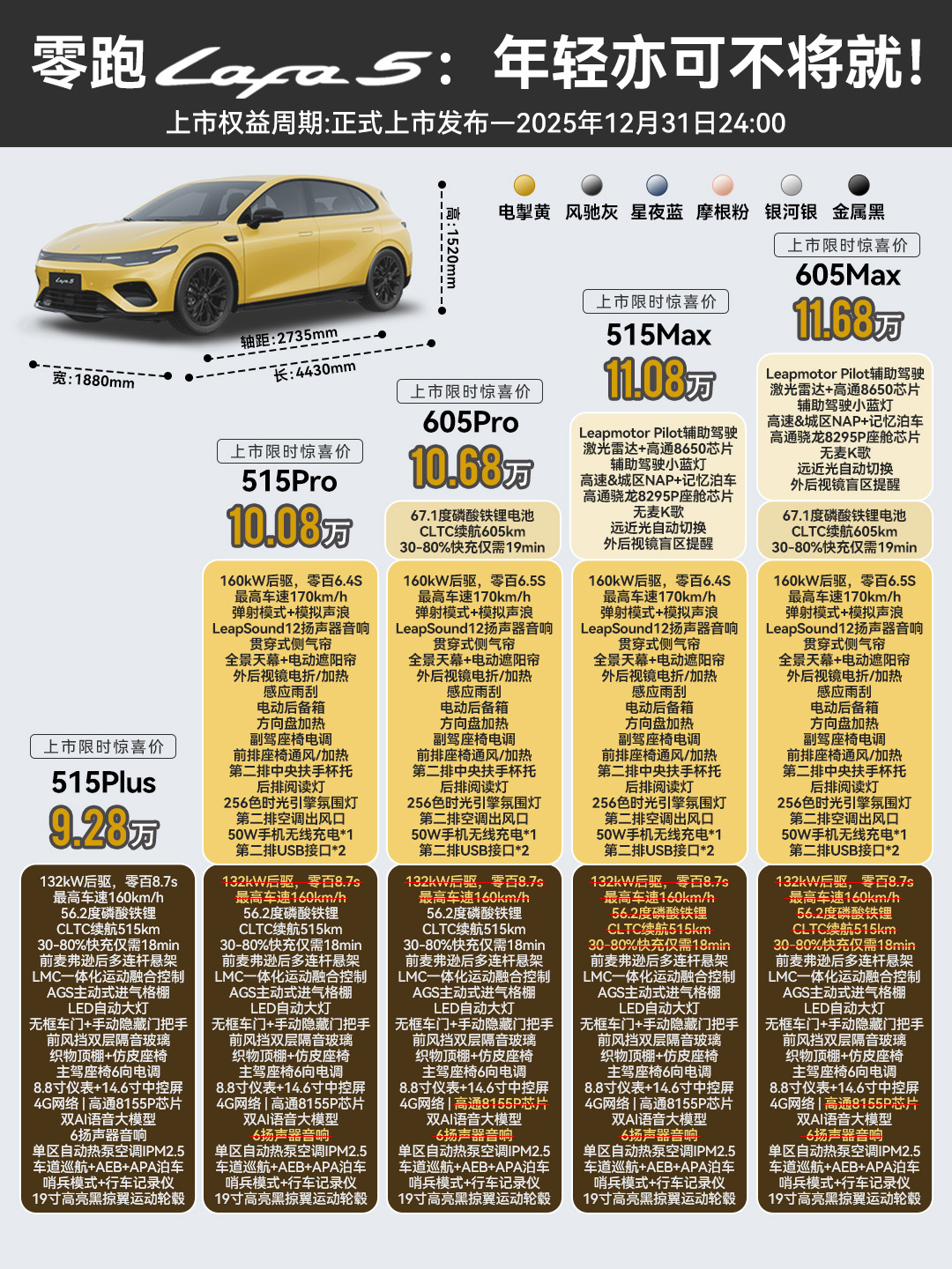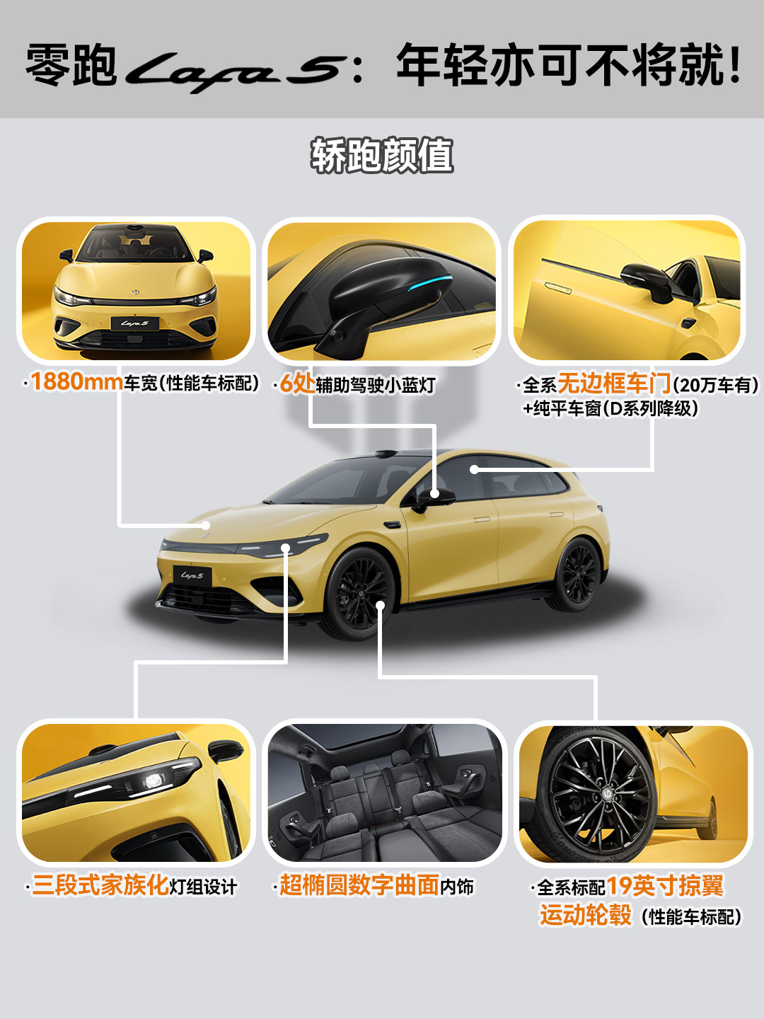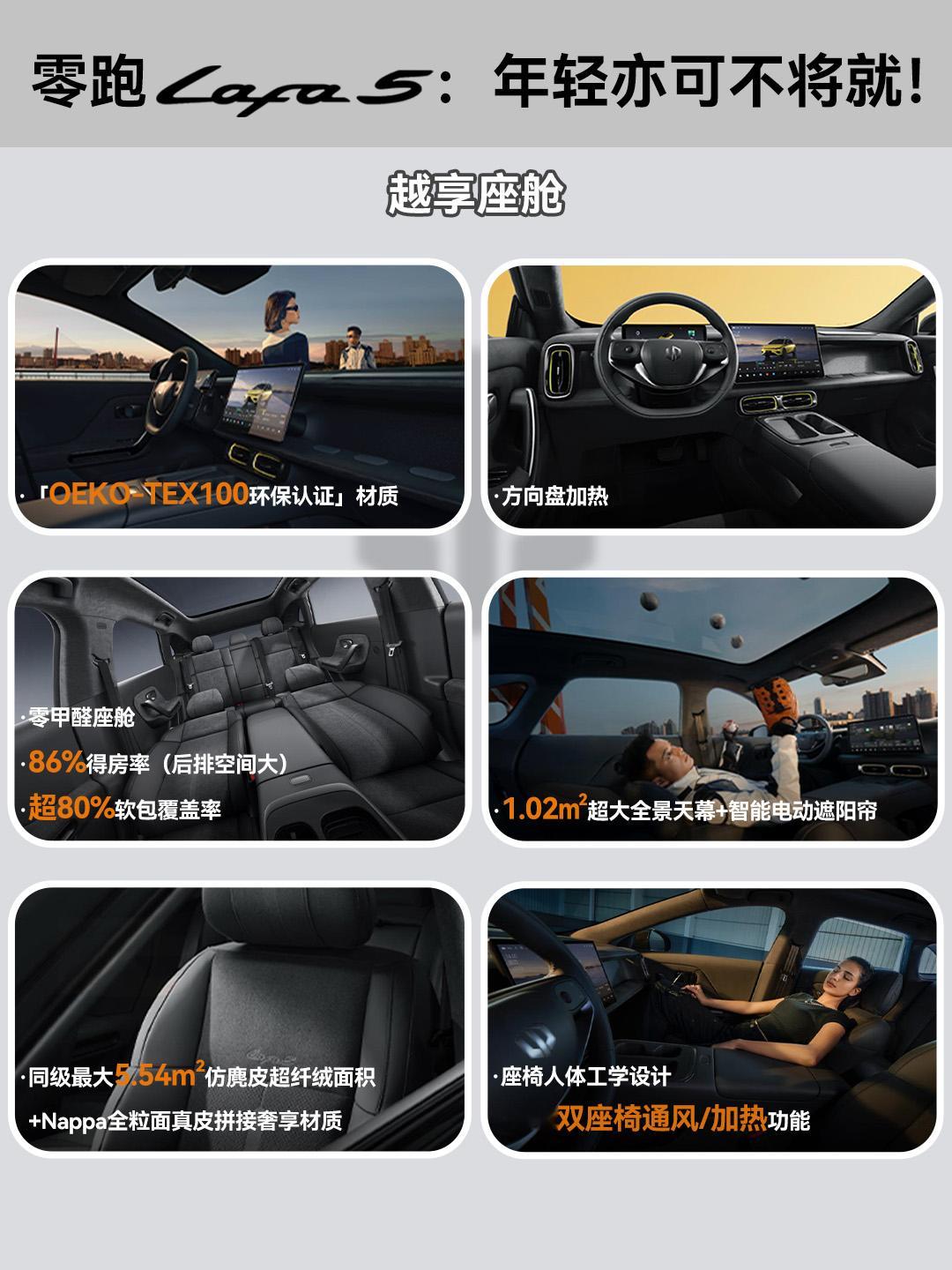 当下,10万级纯电车市场依旧一片红海,而零跑Lafa5的入场,显然没打算走常规的家用路线,而是以更年轻、更个性、更运动的调性,要给这个传统赛道注入一丝新鲜血液。单看外观,Lafa5就跳出同级别普遍卡在1750mm左右的车宽,它直接拉到1880mm,配合全系标配的19寸掠翼运动轮毂,视觉上的宽体和侵略感,是同级少有的;无边框车门+纯平车窗的组合,以往也是专属于20万级车型的配置,如今被Lafa5打成了全系标配,再加上6处小蓝灯,这种自带“潮玩属性”的设计,刚好踩中了年轻用户对“个性潮酷”的新需求,在同质化的车堆里,辨识度立住了。驾控层面,Lafa5更是同级的一把好手:后置后驱+160kW油冷电驱的组合,5米17的转弯半径,让Lafa5在城区窄路和地下车库里穿行的时足够的“从从容容,游刃有余”,再加上Stellantis欧系底盘的调校风格,过弯时的侧倾控制也更加舒适稳定,还有富有驾驶乐趣的弹射起步+专属UI+模拟声浪,都是能给年轻用户们随时随地的情绪价值和茶余饭后的谈资,也让Lafa5一下就跳出了“十万级车只能代步”的刻板印象。座舱体验上,Lafa5精准踩中了年轻用户的喜好:得房率高达86%,后排空间也相当能打;超80%的软包覆盖+OEKO-TEX环保材质,5.54m²仿麂皮超纤绒面积+Nappa全粒面真皮拼接,既照顾了年轻人对质感的要求,零甲醛座舱又规避了新车异味的痛点;1.02㎡的全景天幕配智能遮阳帘,完美兼顾科技感和实用性。续航与安全这块,也同样能打:605km的CLTC续航足够覆盖周通勤+周末自驾,18分钟30%-80%的快充效率,补上了年轻用户“不想等太久”的补能痛点;而77.5%的高强钢占比+CTC2.0电池底盘一体化结构,则是在“玩得爽”的同时,也把安全兜底做足了。 但更能体现它“年轻向”定位的,是配置上的精准划分:入门版标配基础辅助驾驶功能、哨兵模式、360°全景影像与外放电功能——这些恰好是年轻用户出行、长途自驾、露营野餐的“刚需装备”;Pro版主要在性能和舒适性配置上做了强化;顶配版则针对性强化智能化和辅助驾驶的体验,例如激光雷达、高通8295芯片以及城区NAP等等,以满足不同人群的用车需求。本质上,Lafa5的出现给10万级纯电市场弄了个“新选项”,它不走寻常路,而是用“个性设计+运动驾控 + 智能下放”,让年轻人可以不必再在“实用”和“喜欢”之间做取舍,我就问一句,评论区的朋友们,你心动了吗?