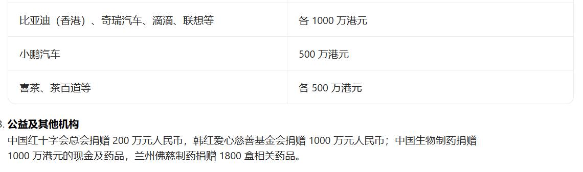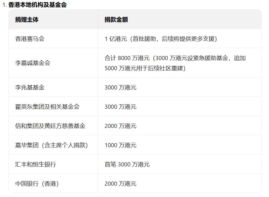 一方有难,八方支援,作为一个中国人,我感到非常的骄傲和放心。 截至 2025 年 11 月 27 日 24 时,香港大埔宏福苑火灾相关的各界捐款及物资总额已超 6 亿港元,且后续捐款仍在持续汇集。同时香港特区政府还投入 3 亿港元作为 “大埔宏福苑援助基金” 的启动资金。 这才是大国风范,这只有我们中国才有的互助精神,这些企业才是真正的有担当有魄力,企业赚钱,有事情的时候企业出钱出力,回报社会,感恩各个企业。 相信我们最伟大的企业HW,应该也在准备了,他现在会捐的更多,毕竟我们举国供养他,他同样会给予足够的回馈。网络上有不少喷子说没有看到HW的捐款,就有风言风语传出,这些人绝对会被打脸的,人家不是不捐,是憋个大的,我把话放在这里,坐等他们被打脸。